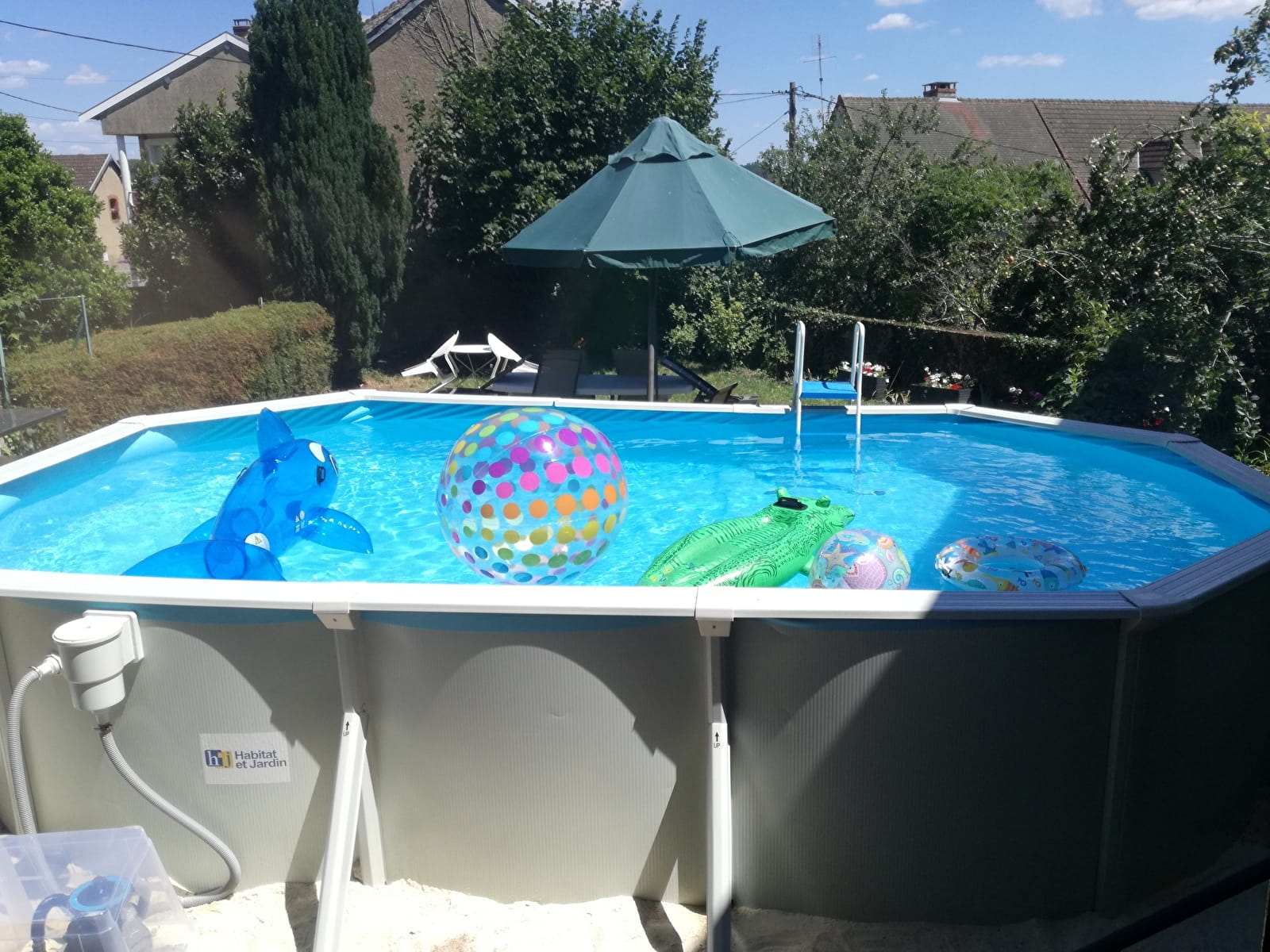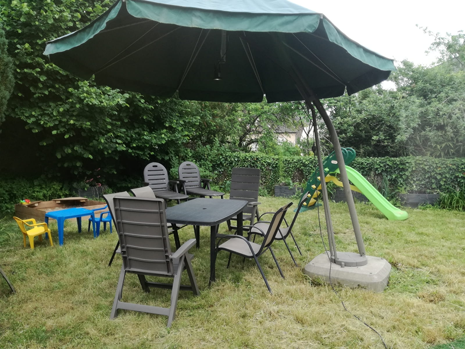 Jardin clôturé , barbecue , meubles de jardin , piscine , toboggan , bac à sable