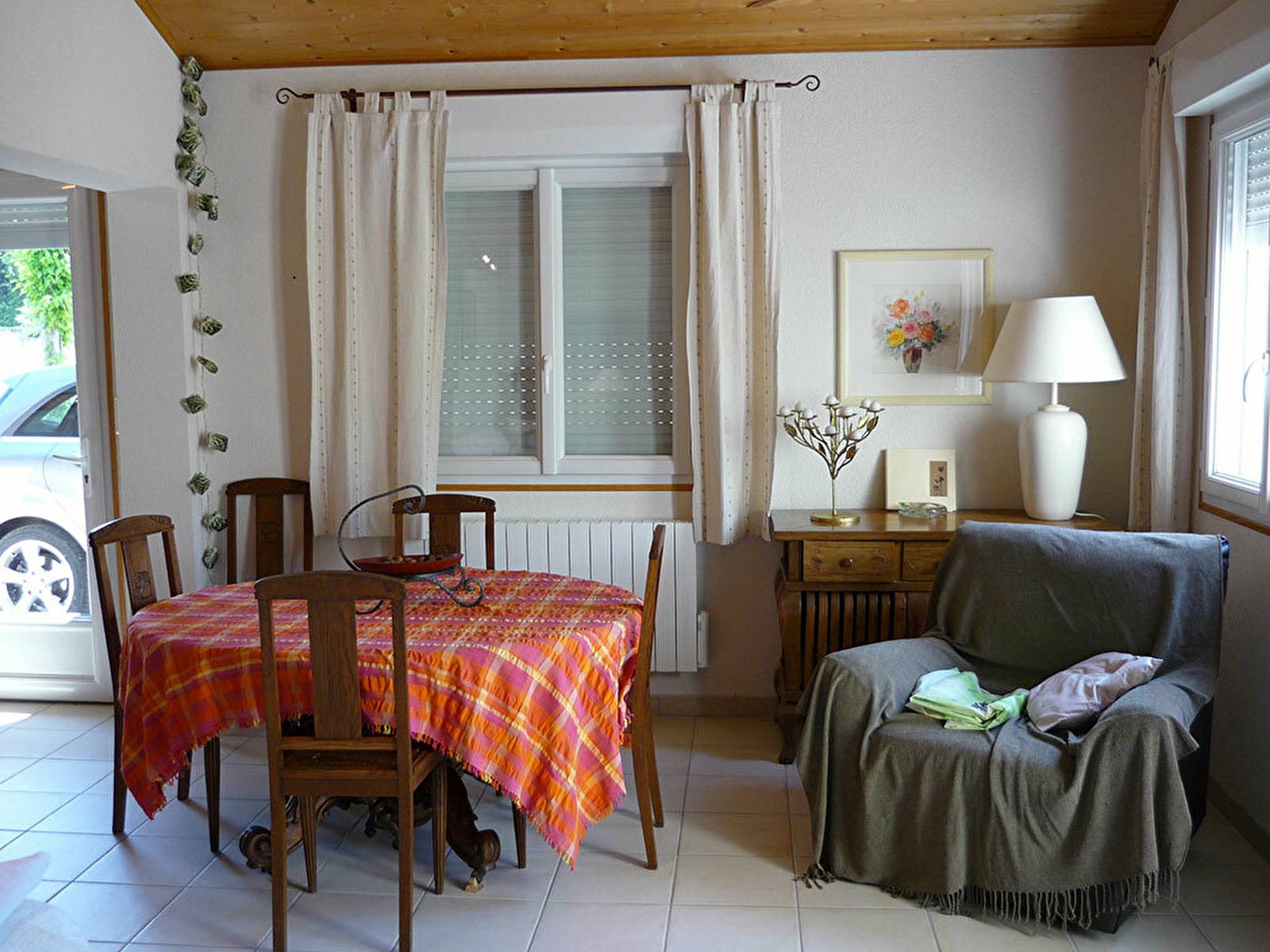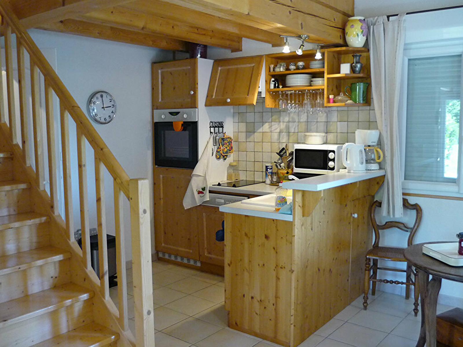 Au rez-de-chaussée, une grande pièce de vie, cuisine équipée ouverte sur le séjour avec accès direct sur la terrasse orientée plein sud, découvrant le jardin.
