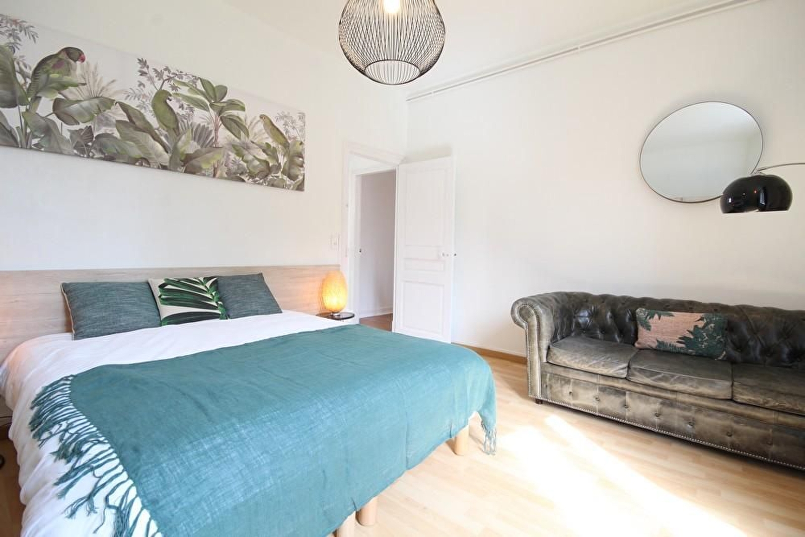 Cet appartement est communicant avec un autre, situé à l'étage et offrant une cuisine équipée, salle à manger-salon avec canapé convertible offrant 2 couchages de bonne qualité. Une chambre avec un lit 160 indépendante et une seconde chambre (lit 160 également) avec salle de bains communicante. WC séparé avec lave-mains. Petit balcon. Décoration de style végétal et tropical pour cet étage. Un dernier appartement avec 3 couchages.