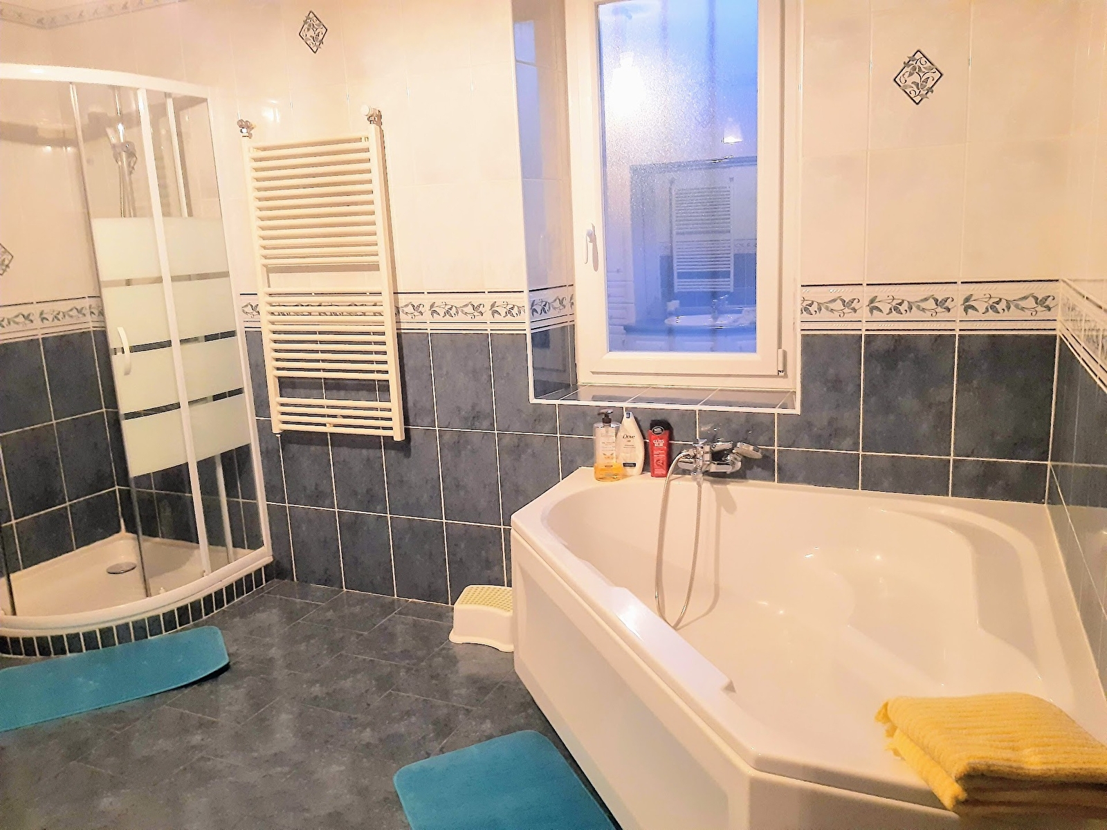 1 salle de bain avec double vasque, toilettes, douche et baignoire.