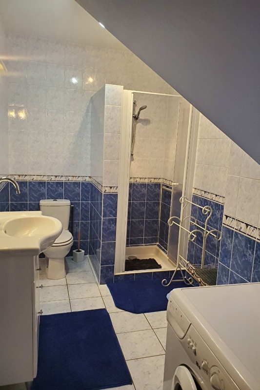 La salle d’eau avec cabine de douche se est très fonctionnelle, avec lave-linge privé, espaces de rangement et divers appareils proposés.