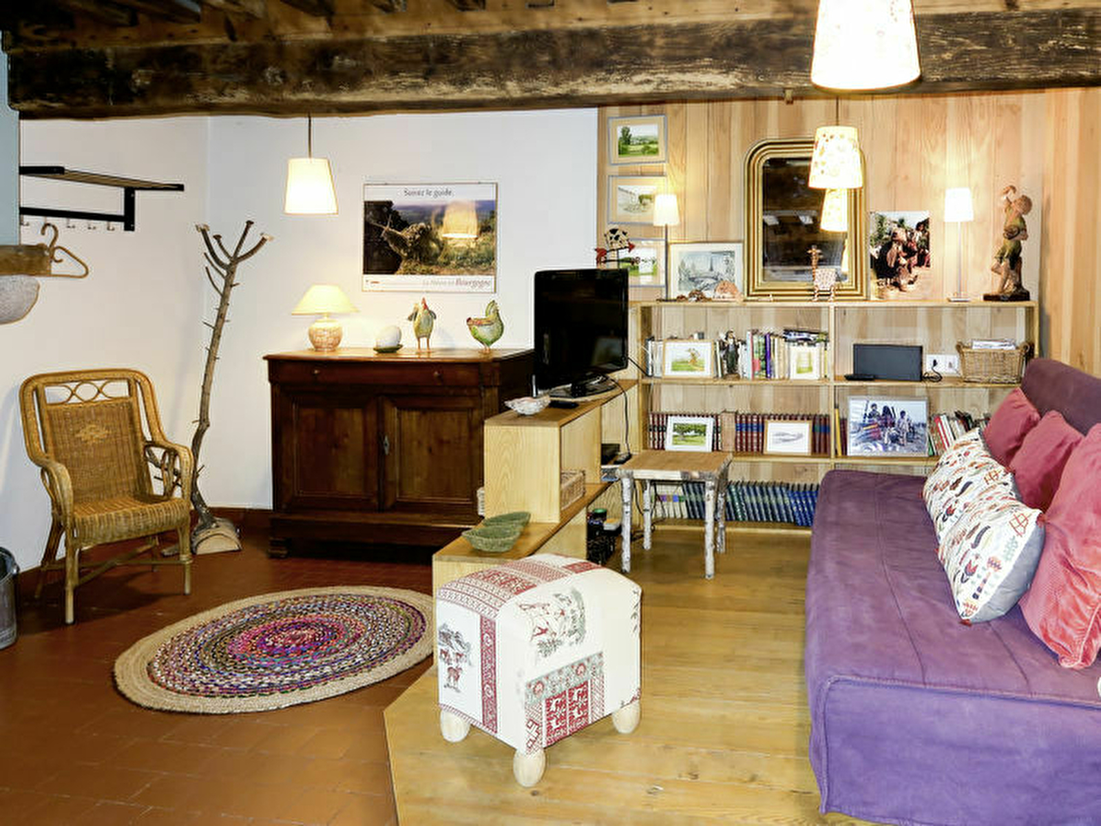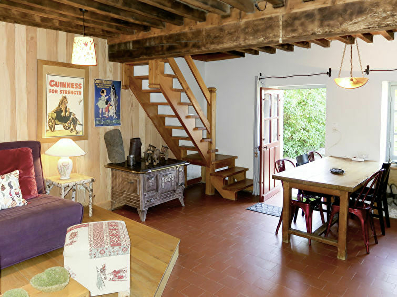 "Marguerite", maison 2 pièces 70 m2 sur 2 niveaux. Aménagement rustique et plaisant: séjour/salle à manger avec table pour les repas, TV (satellite), chaîne stéréo et poêle à bois. Sortie sur le jardin.