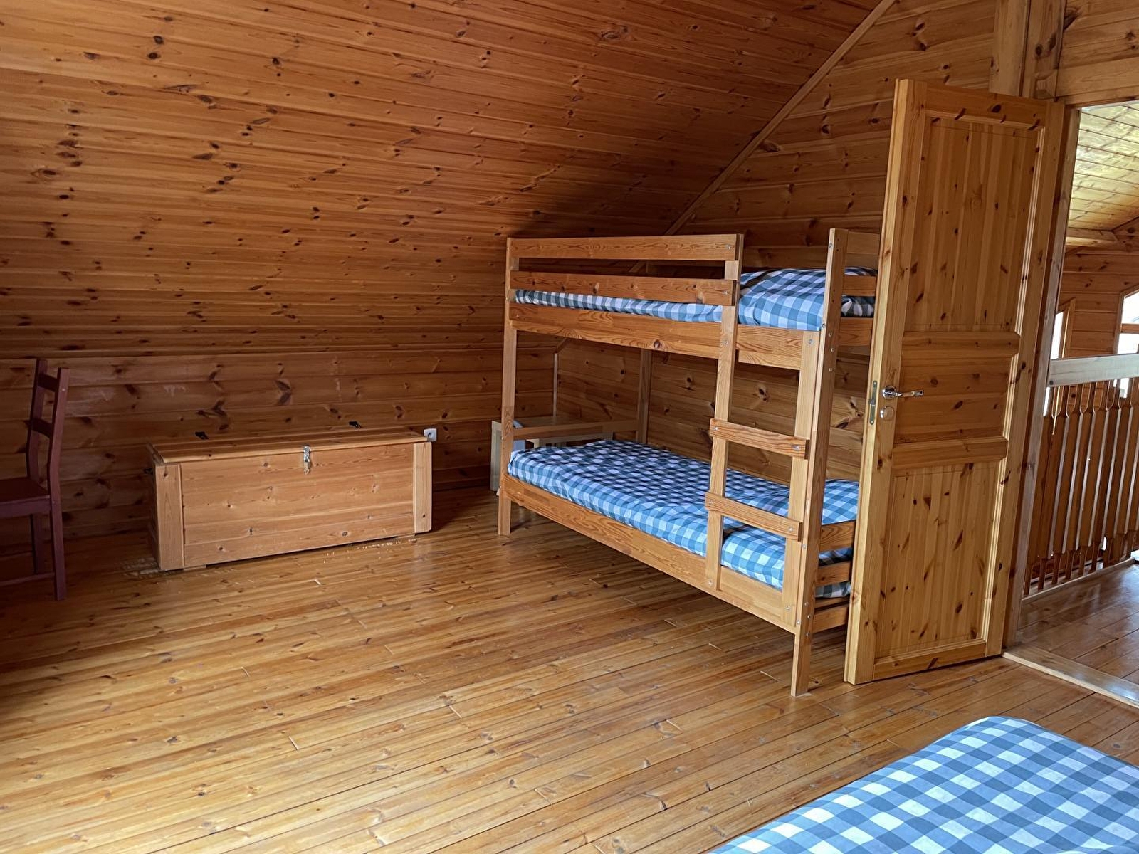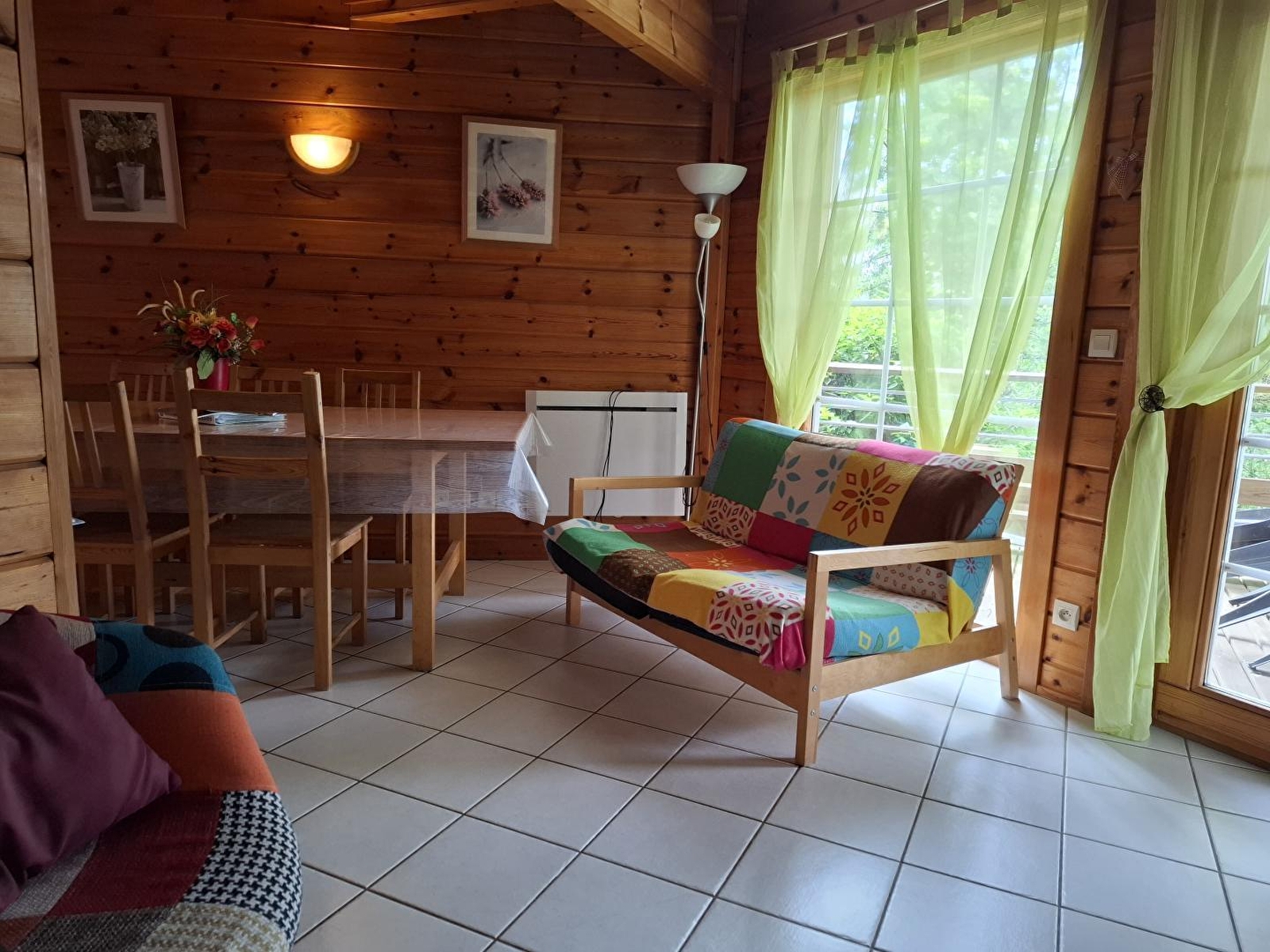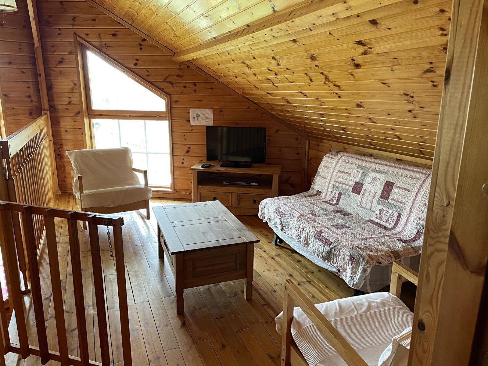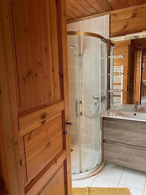 Dans un cadre naturel, chalet bois (MELEZE) entièrement neuf et indépendant, situé sur un terrain comportant 4 autres gîtes. Cuisine intégrée toute équipée (micro-ondes), salon-séjour (poêle à bois) avec de grandes baies vitrées ouvrant sur la terrasse, salle d'eau (douche hydrothérapie et sauna finlandais pour 4 pers), ch1 1 lit 2 pl, buanderie (sèche-linge). A l'étage : salon en mezzanine (canapé-lit 2 pl), ch2:1 lit 2 pl + 2 lits 1 pl superposés. Chauffage électrique et poêle à bois. Terrain attenant non clos, salon de jardin, barbecue. Option ménage à 60E. Piscine, tennis et terrain de jeux municipal à 100 m.