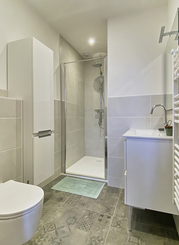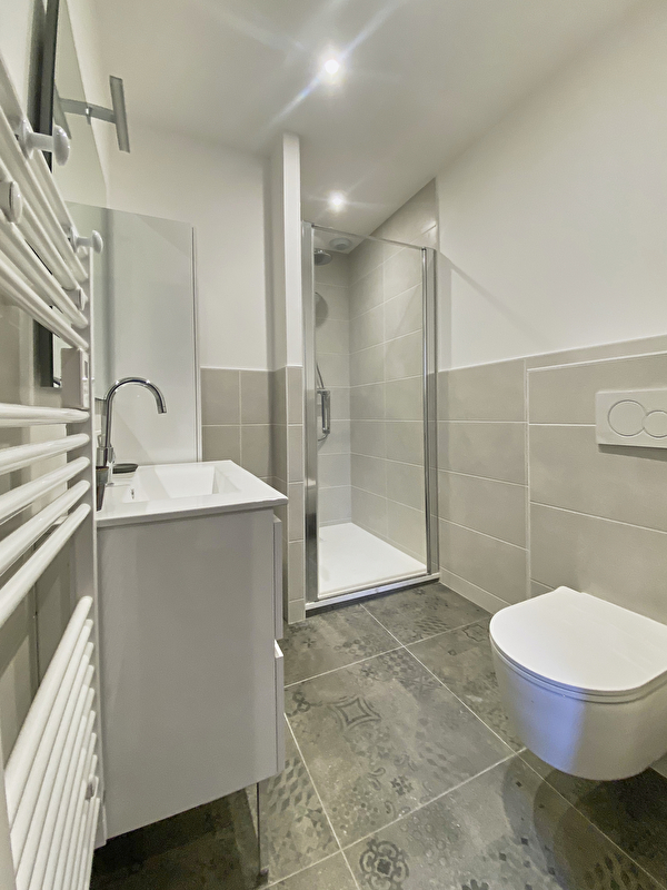 Salle de bain avec meuble de rangement, douche et toilettes suspendues.