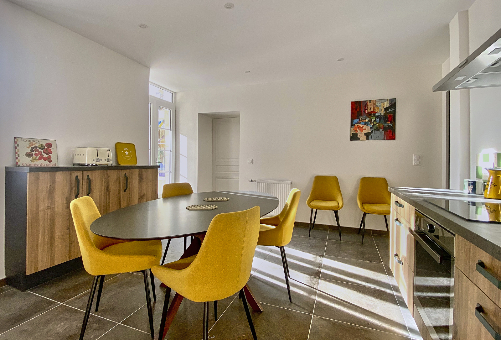 Télévision, enceinte connectée, et un espace repas pouvant accueillir 12 convives.