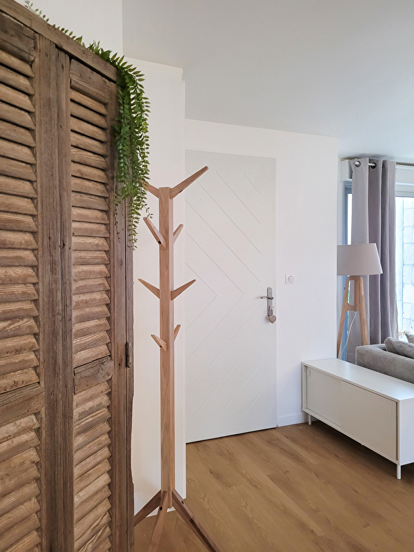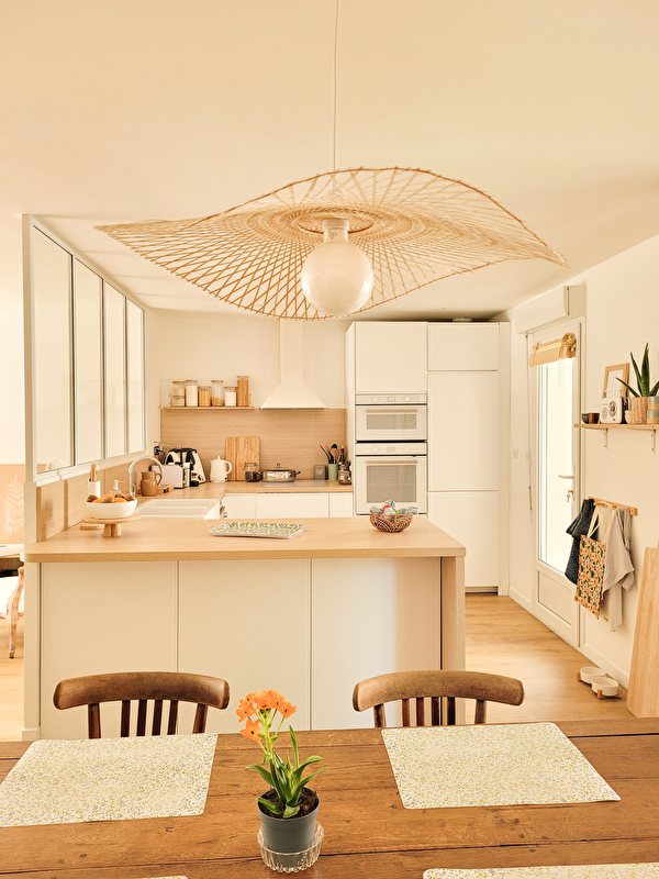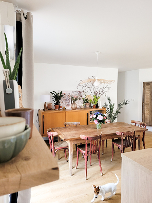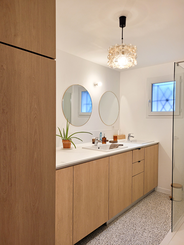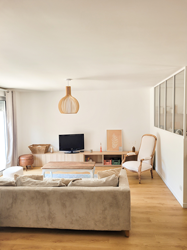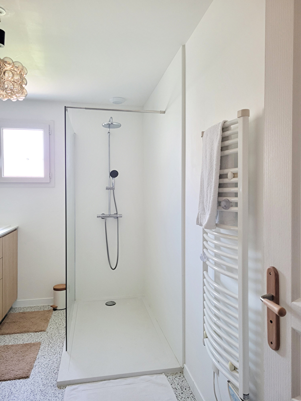 La maison est composée d'une belle pièce de vie lumineuse de 50m2 avec cuisine ouverte toute équipée, 3 chambres avec lit double, salle de douche avec double vasques et wc indépendant.