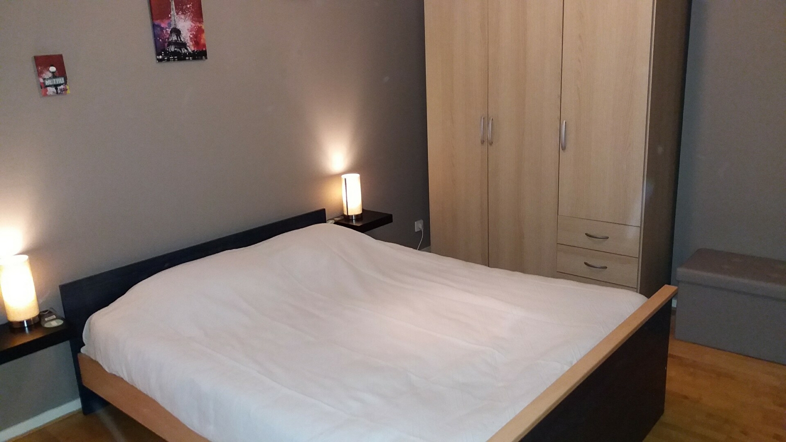 Chambre avec lit double, lit parapluie pour bébé et armoire ;