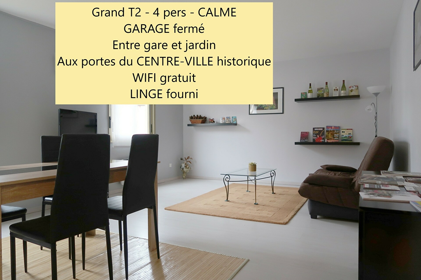 Situation privilégiée pour ce grand appartement T2 (57 m2) avec garage privatif classé 2* par Gites de France d'une capacité de 4 personnes (2 couchages). Résidence donnant sur le jardin botanique de l'Arquebuse, à proximité immédiate de la gare Dijon-Ville et du centre ville de Dijon. Tous les monuments sont accessibles à pied en quelques minutes.