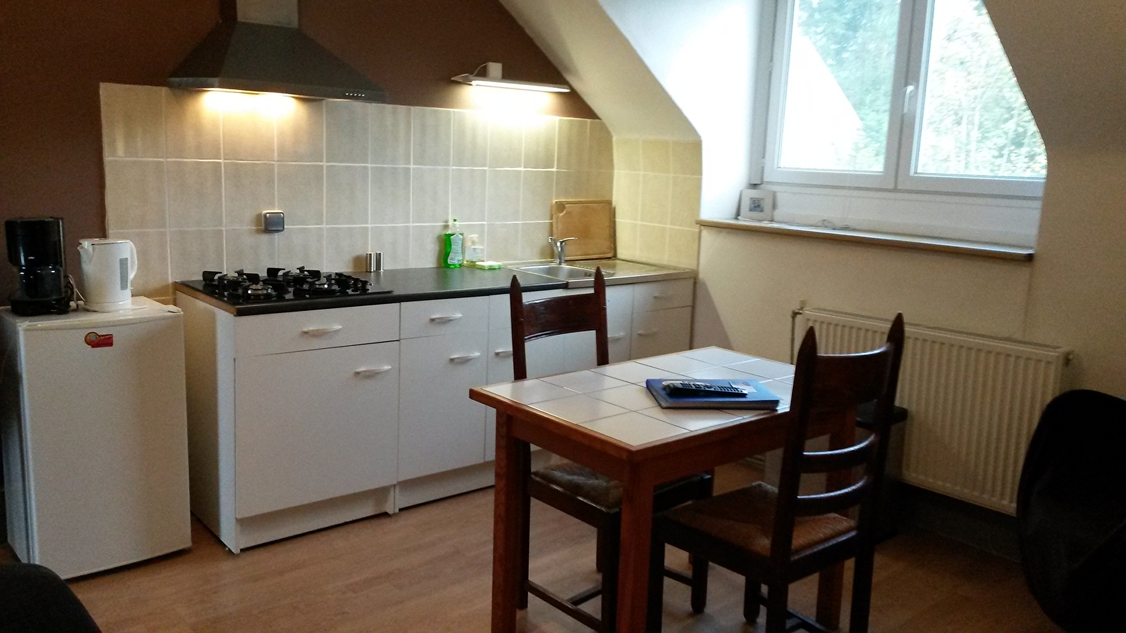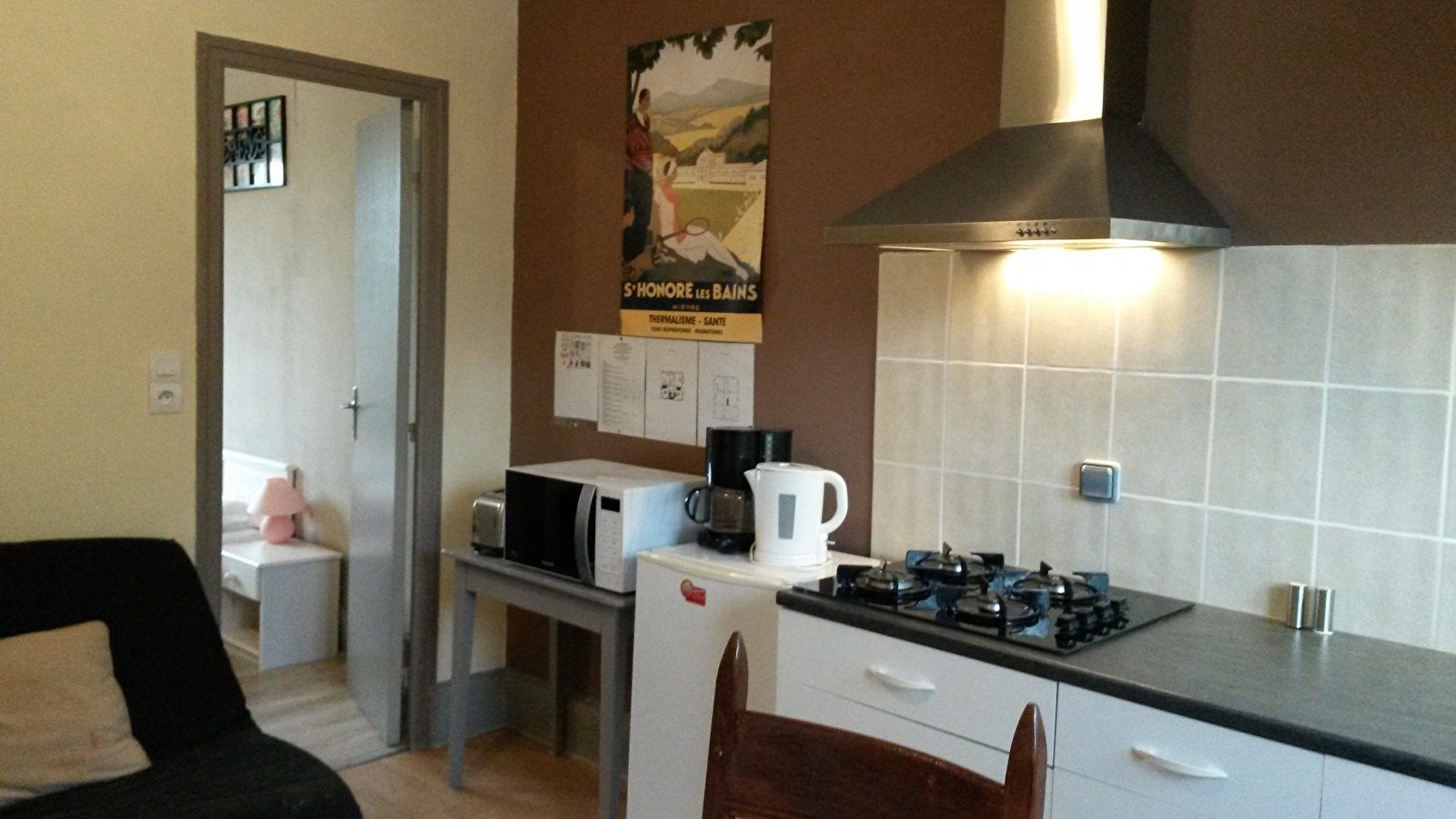 Une kitchenette dotée d'une cuisinière, d'un micro-ondes et d'un réfrigérateur est à votre disposition pour préparer vos repas maison, que vous pourrez savourer dans le coin repas.
