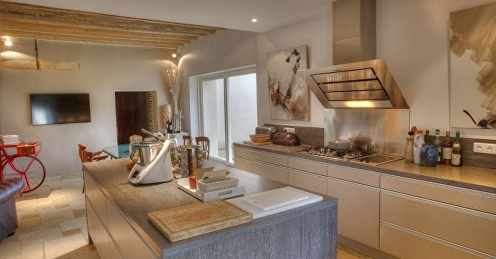D'une superficie de 120 m², la maison dispose en rez-de-chaussée d'une grande pièce à vivre avec poutres apparentes, où se succèdent la cuisine, entièrement équipée (four, four micro-onde, réfrigérateur américain avec congélateur, lave-linge et étendoir à linge), le coin salon (avec canapé convertible et télévision) et l'espace salle à manger, ainsi que de toilettes avec lave-mains.