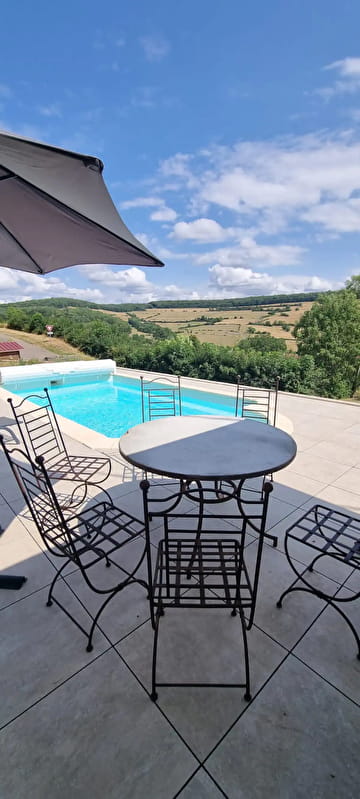 Une grande terrasse avec piscine chauffée sur une vue imprenable.
