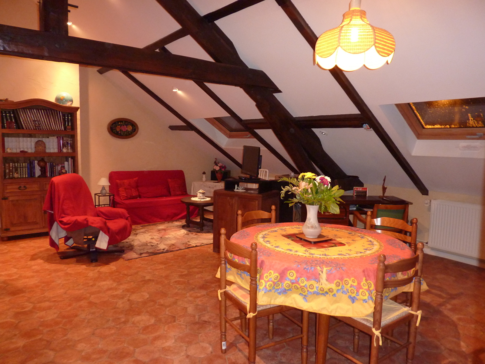 Au 1er étage, appartement meublé de 52 m² dans maison avec entrée indépendante et une grande pièce à vivre. Ce logement dispose d'une chambre, d'une cuisine équipée et d'une salle de bains. Terrasse et salon de jardin à disposition.