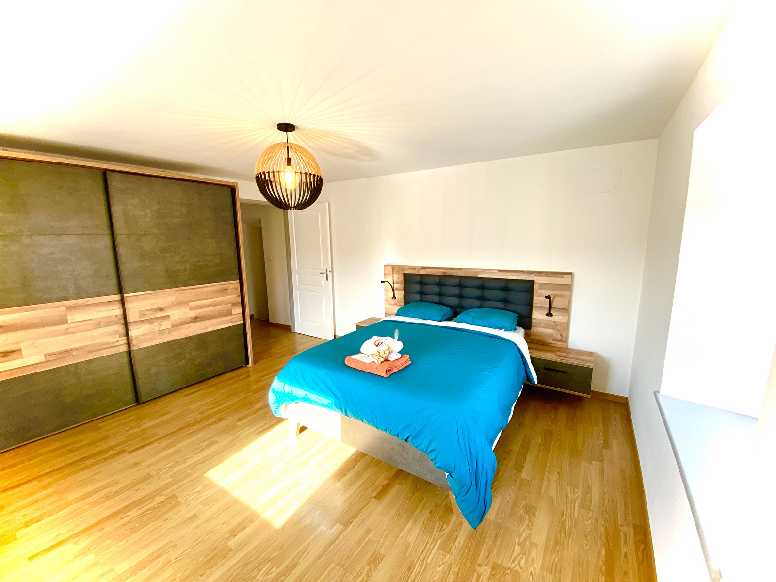 - La chambre est équipée d'un lit double agrémenté de ses tables de chevets avec des lampes incrustées dans le lit ainsi qu'une prise USB pour recharger vos appareils Elle possède également une grande armoire.