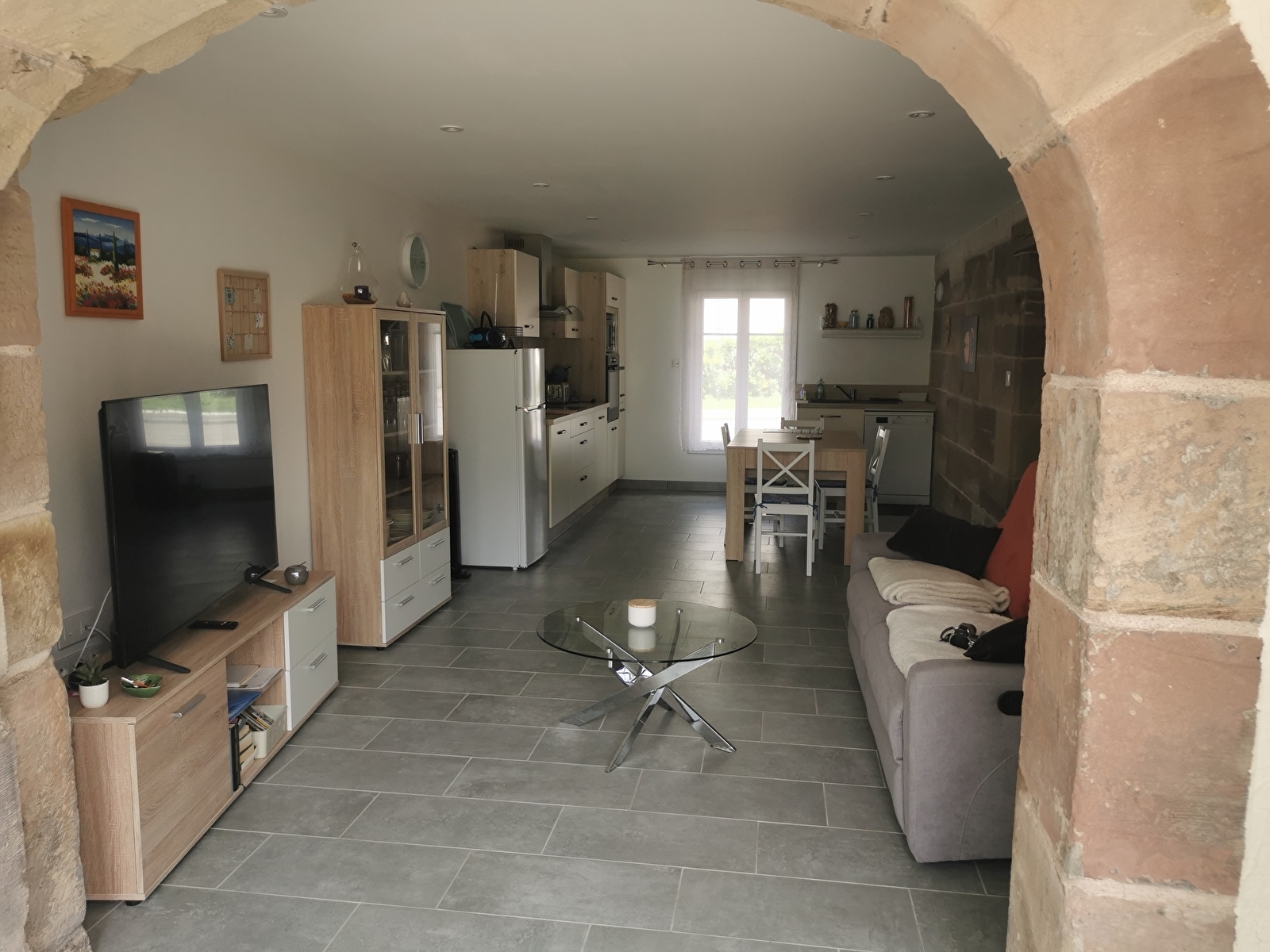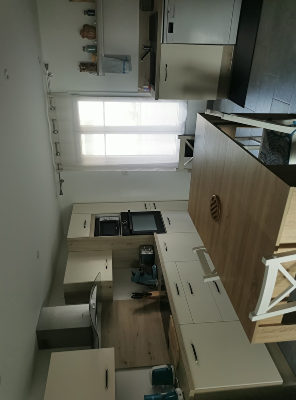 Cuisine équipée ouverte sur salon (télévision, plaque de cuisson, four, réfrigérateur avec compartiment congélateur, micro-ondes, lave-vaisselle, hotte, cafetière, théière, grille-pain ... ).