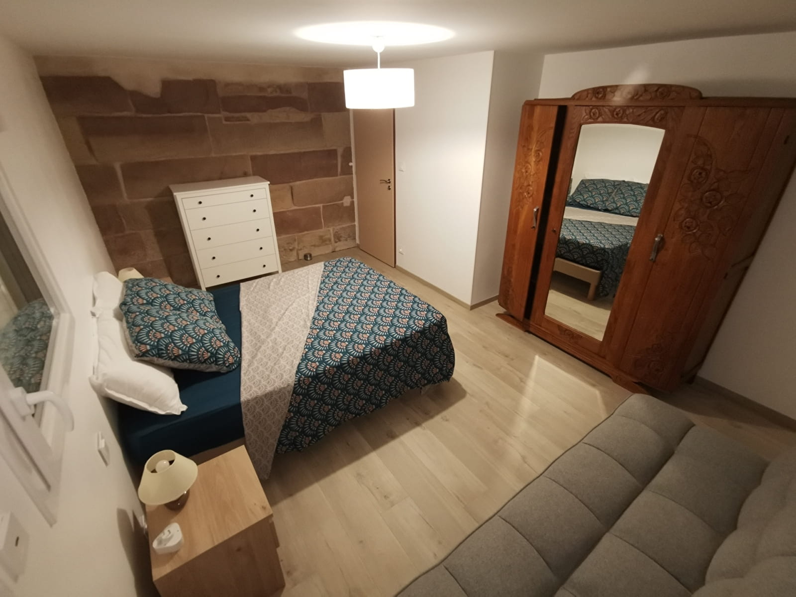 Chambre de 15m2 avec lit de 140 x 190 , 2 tables de chevet, armoire et commode.