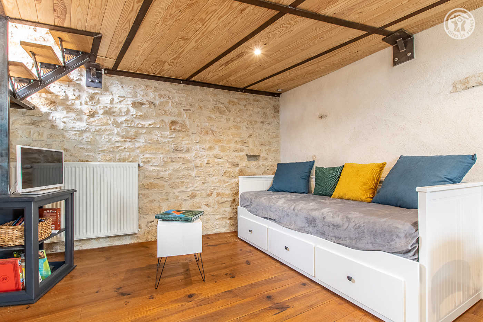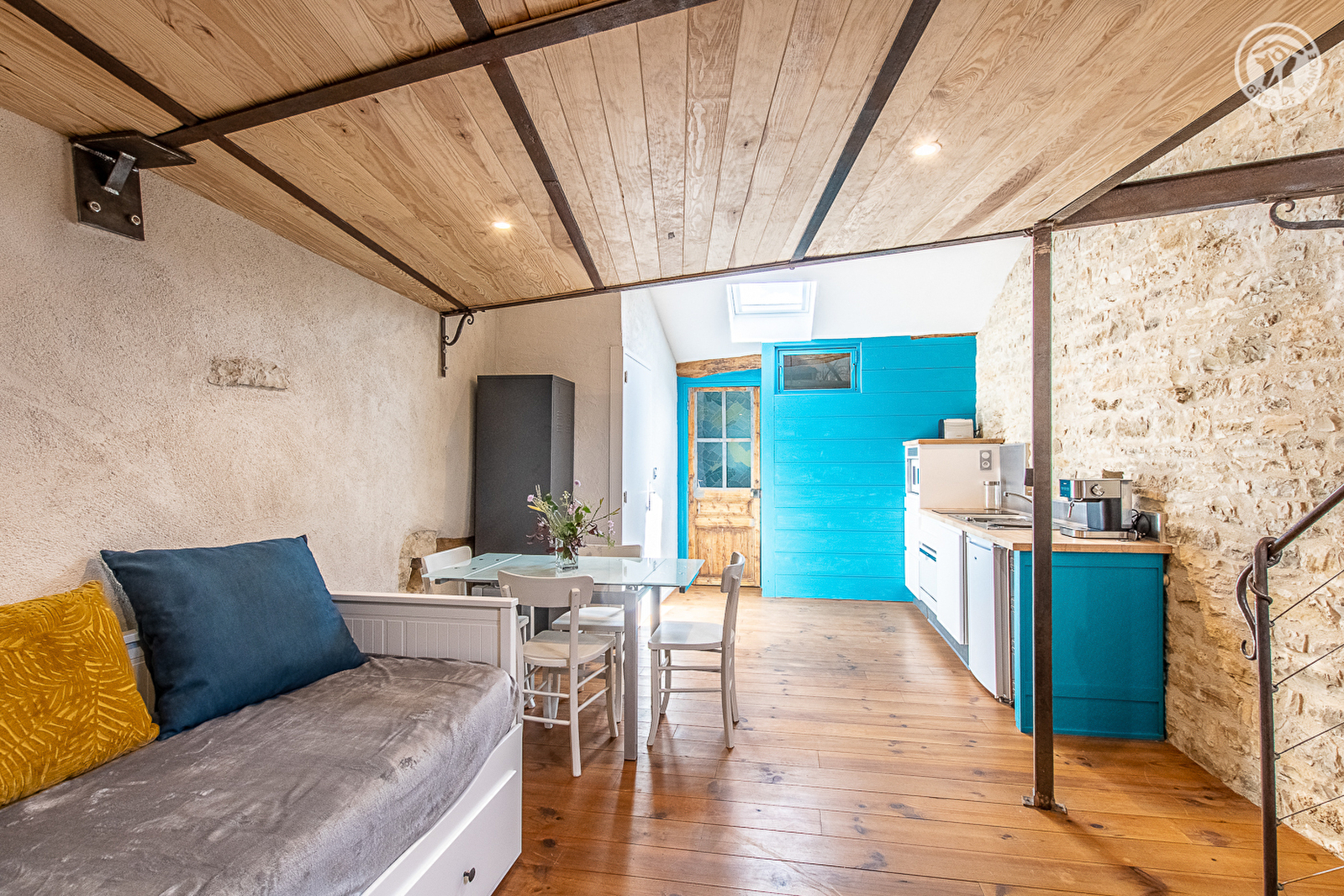 Composition : Maison mitoyenne à l'habitation des propriétaires et 2 autres gîtes (indépendance totale). Wifi. Chauffage central fioul + Poêle à bois. Buanderie commune (lave-linge). Gîte au 1er étage : pièce unique ouverte en « open-space » sur 2 niveaux, comprenant un espace cuisine-salon-séjour (canapé convertible 2 p. de 160x200cm), un espace « chambre » sur mezzanine (2 lits 1 p. 80x20cm jumelables en lit 2 p. 160x200cm), une salle d'eau (douche/Wc). Jardin privatif (à 50m). Terrain commun de 12 ha (table ping-pong). Local vélos. Parking privé. Commodités 5 km.