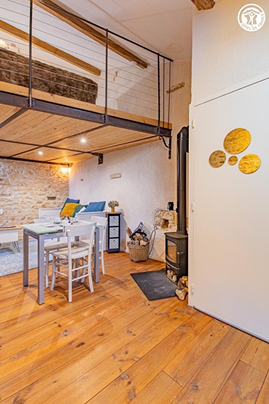 Composition : Maison mitoyenne à l'habitation propriétaires et 2 autres gîtes (indépendance totale). Wifi (fibre). Chauffage central fioul + poêle à bois. Buanderie commune (lave-linge). Gîte au 1er étage : "open-space" sur 2 niveaux, comprenant espace cuisine-salon-séjour (canapé convertible 2 p. de 160x200cm) & salle d'eau (douche/Wc) au rdc et espace "chambre" sur mezzanine (2 lits 1 p. 80x20cm jumelables en lit 2 p. 160x200cm). Jardin déporté (à 200m) + parking privatifs. Local vélo + table ping-pong en commun. Petits commerces dont supérette 5.5 km. Supermarché 10 km.