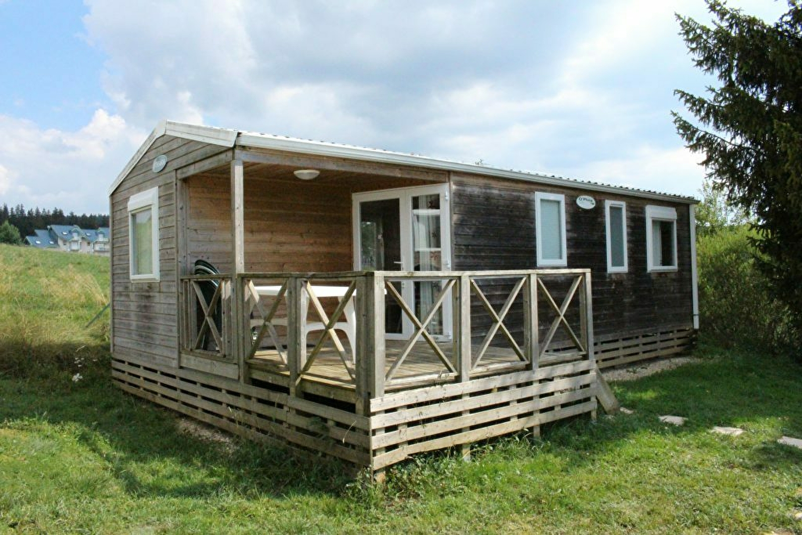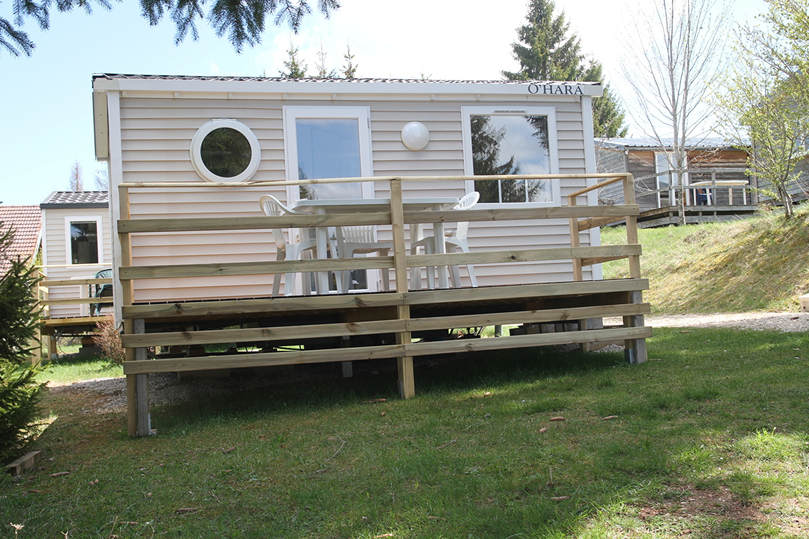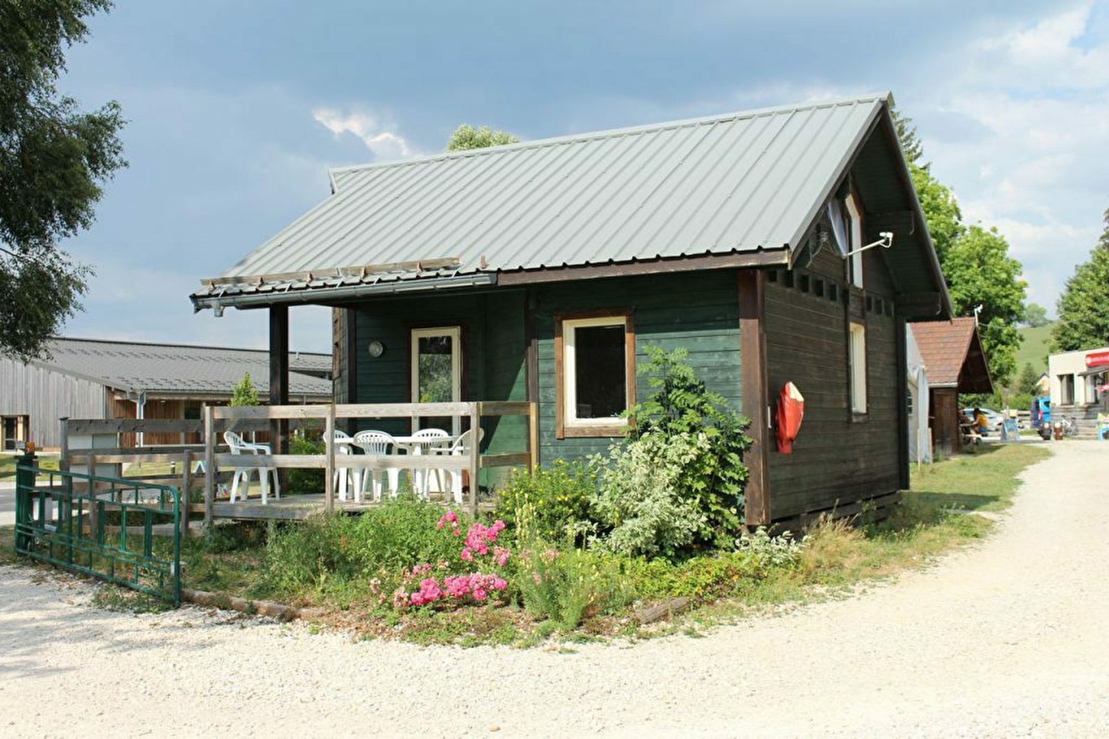En été : plusieurs mobil-homes et chalets dans camping situé à 50m du lac de Remoray.