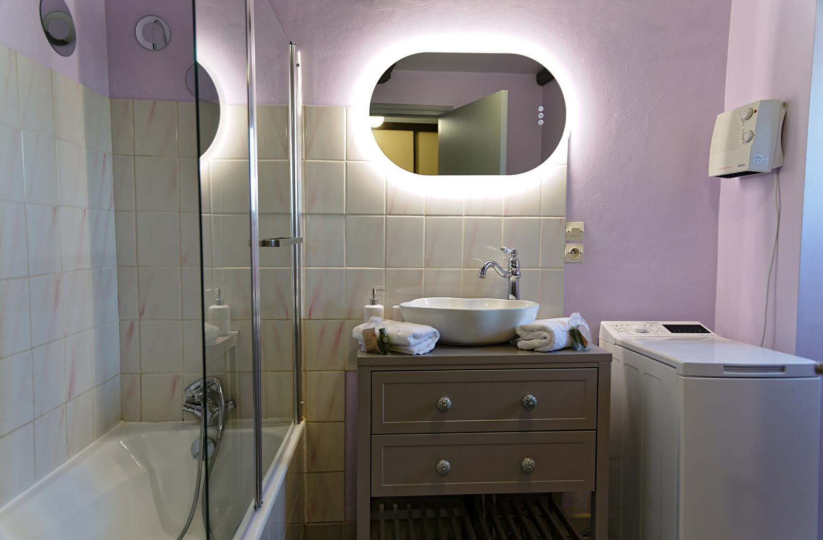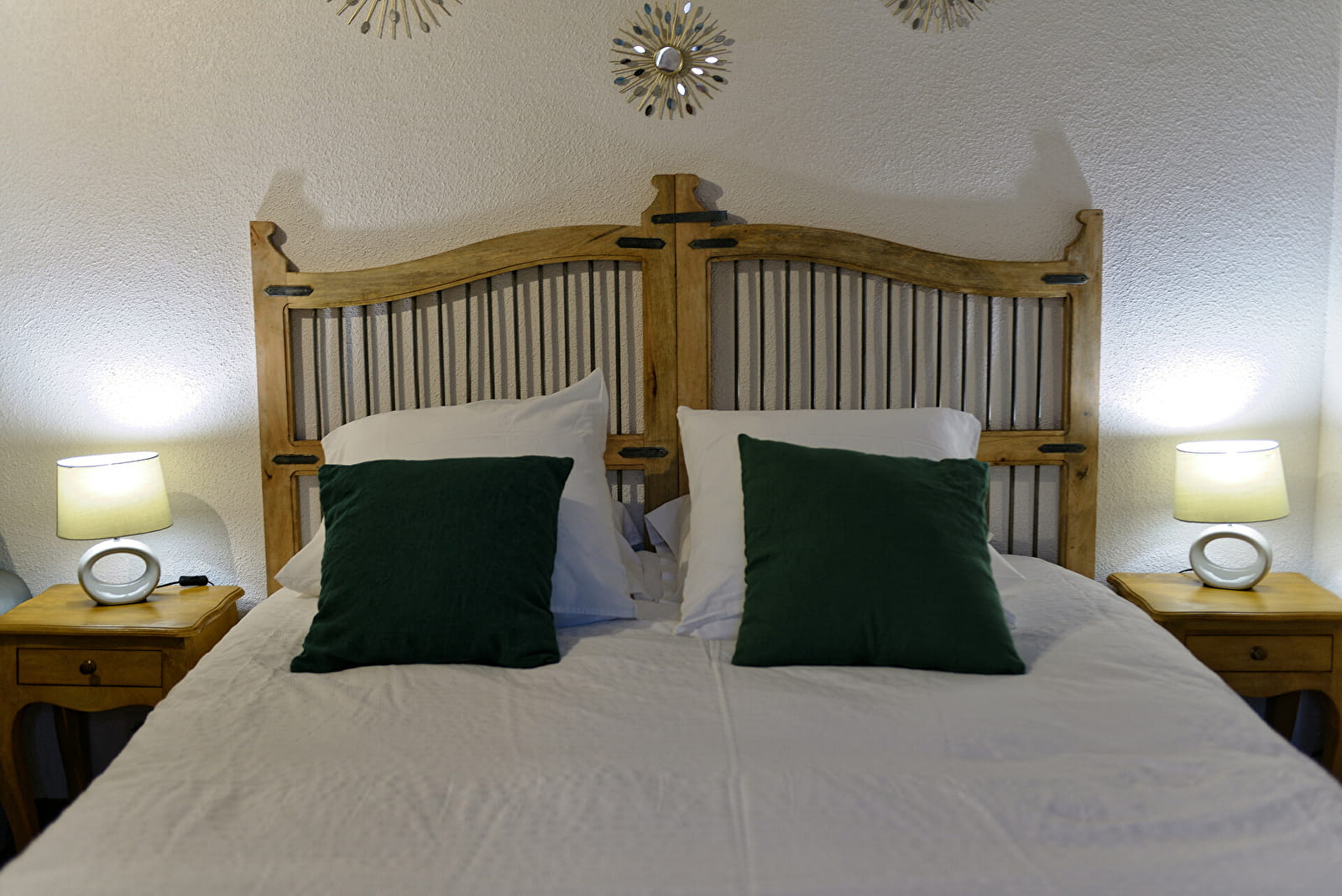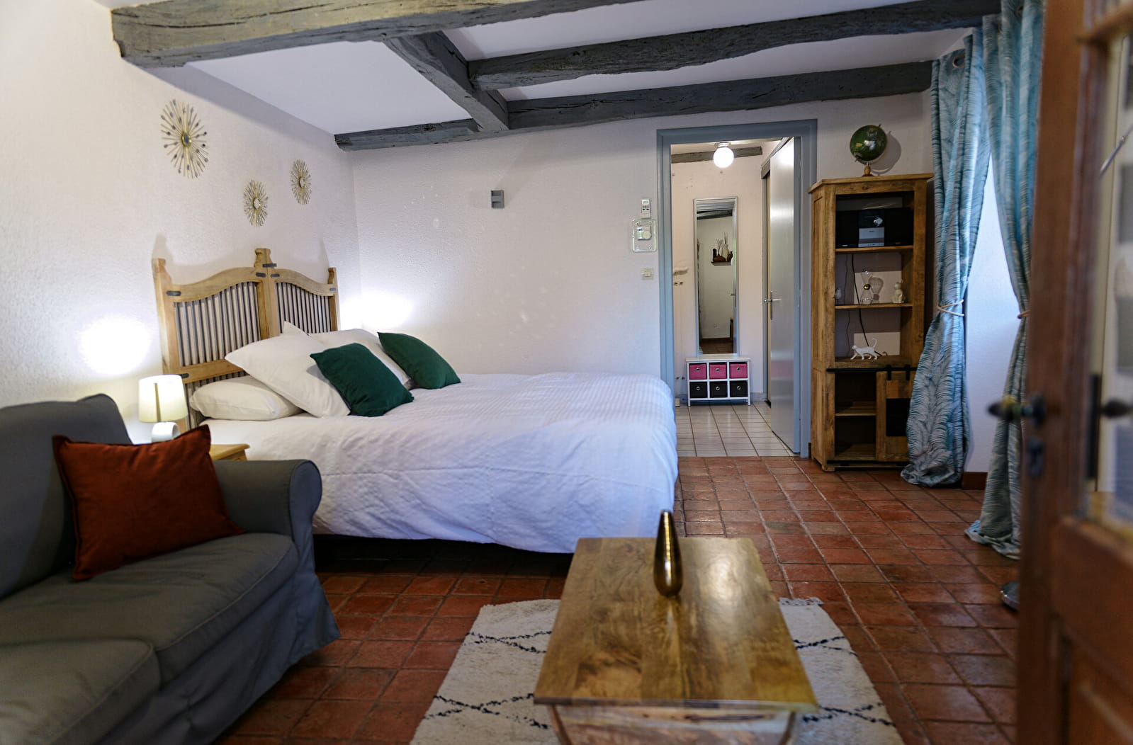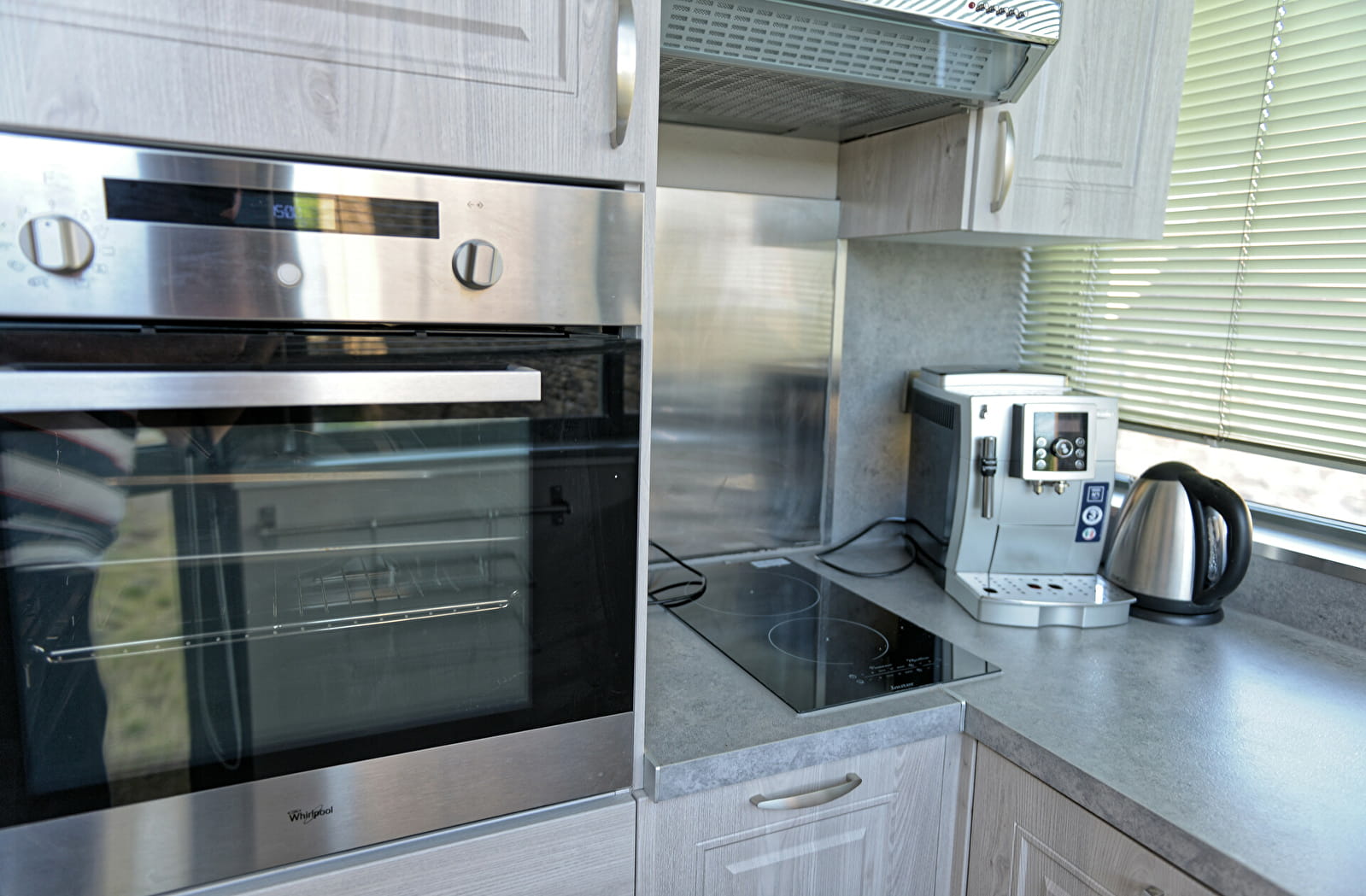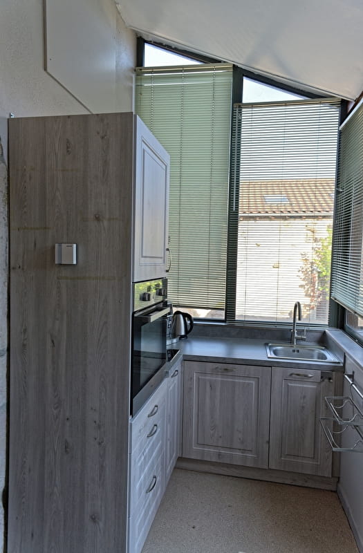 Pour la partie intérieure vous aurez à disposition un lit 160x200 ainsi qu'une salle de bain avec tout confort, une machine à laver, mais également une cuisine tout équipée (four, plaque à induction, frigo, lave vaisselle, broyeur à café, bouilloire, grille pain).