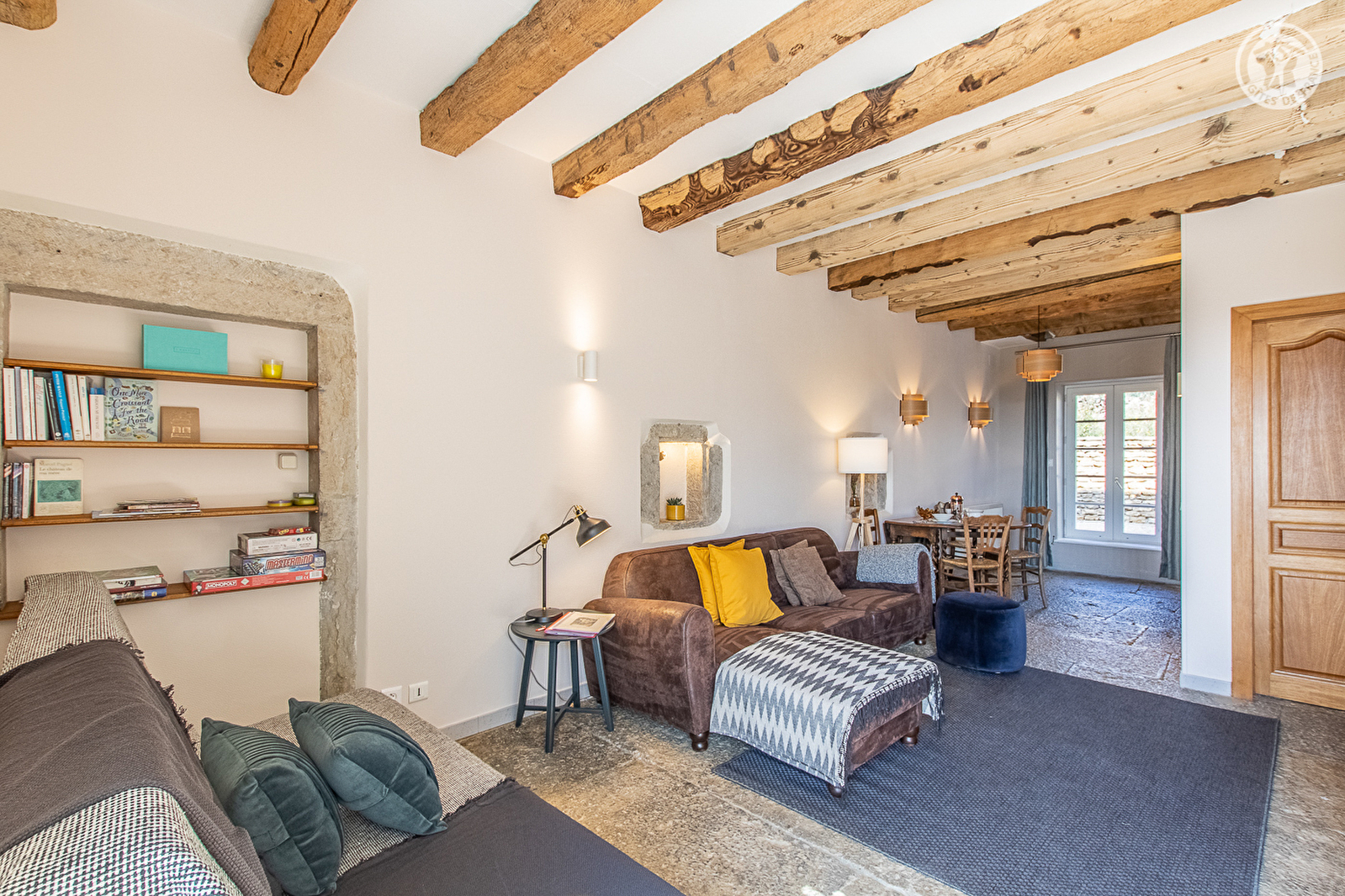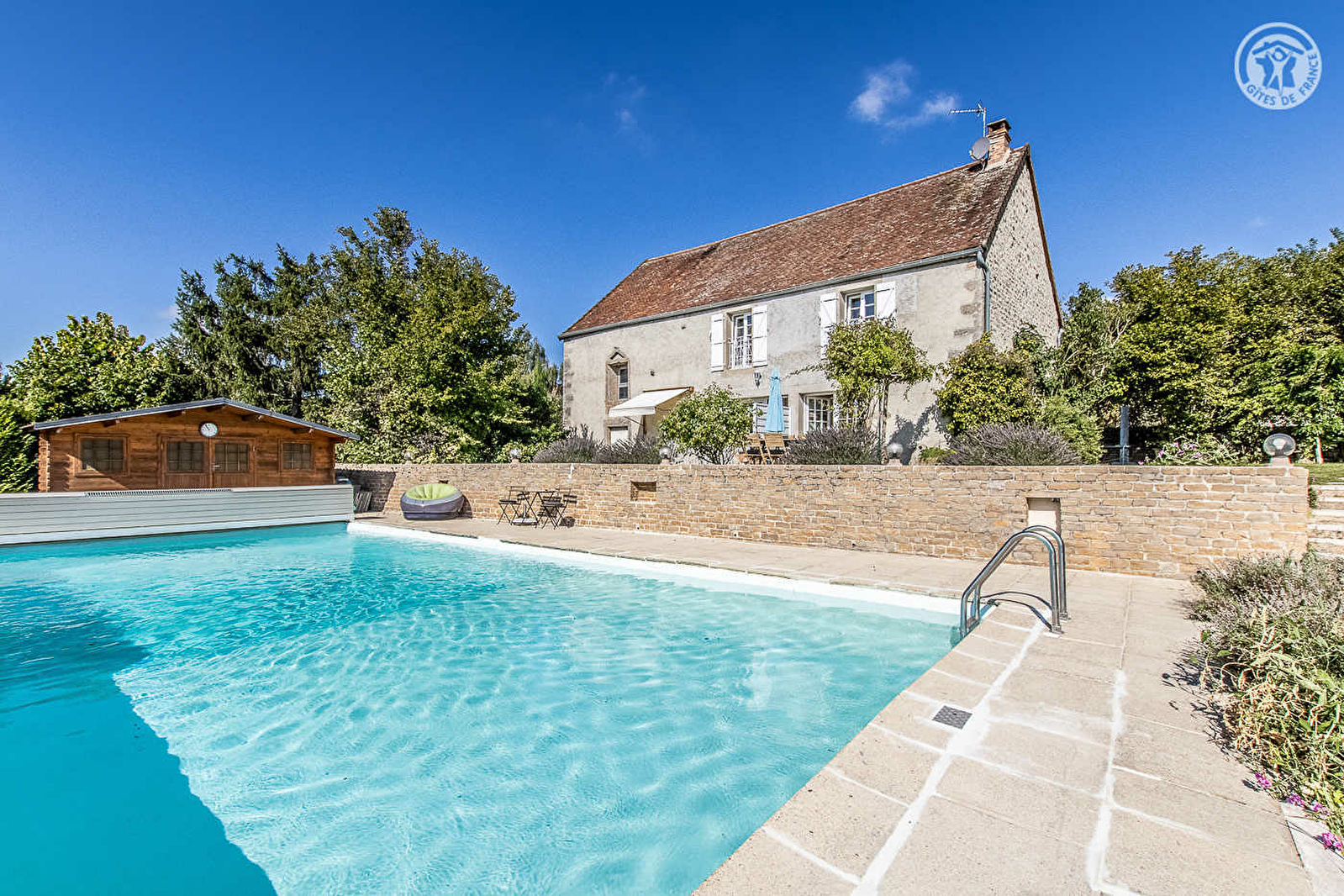 Authentique grange traditionnelle de caractère du XIXe soigneusement restaurée, lovée "en balcon" & "belvédère panoramique" à flanc de coteau sud, en lisière de vignobles. Calme & totale tranquillité, blotti au bout d'une intimiste impasse, au cœur d'un paisible petit village viticole typique juché sur une colline au pied du Mont Rome (point culminant du territoire avec 546m, site d'escalade réputé & belvédère unique pour son exceptionnelle vue s'étendant de la Saône à l'Autunois). En pleine campagne chalonnaise vallonnée, niché entre les bucoliques vignobles du Couchois & des Maranges, au creux d'un ravissant écrin champêtre & naturel préservé de coteaux de vignes, prairies & collines boisées. Gîte de très bon confort. Chaleureuse ambiance "campagne chic" sublimée par l'âme du bâti d'origine (exceptionnel sol en pierres, poutres, niches avec linteaux en pierres…). Beaucoup de charme & caractère. Très cosy. Large terrasse panoramique ombragée. Belle propriété de 4500m² (en commun) pétrie d'histoire (jadis domaine viticole), soigneusement végétalisée & fleurie, comprenant un espace engazonné (avec balançoire), une belle piscine (5x10m), un terrain de pétanque, une table de ping-pong & une agréable prairie "naturelle" abritant un verger fruitier avec chemin de promenade (cerisier, figuier, pommiers, poiriers, noyers…). Sublime panorama sur les vignobles & la campagne environnante. Magnifiques paysages.