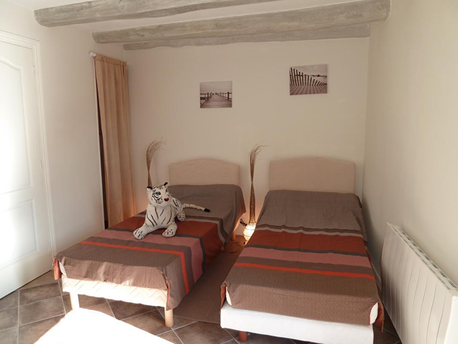 Composition : Maison individuelle. Wifi (fibre). Chauffage électrique + poêle à bois. Plain-pied (rdc) : cuisine, séjour-salon, 3 chambres (2 lits 1 p. 90x190cm / lit 2 p. 160x200cm / 2 lits 1 p. 90x190cm) dont 1 en accès par l'extérieur avec TV & salle d'eau privée (douche/Wc), salle d'eau (douche), Wc indépendant. Jardin clos (1000m²) + terrasse + local vélos + garage (1 place) + parking privés. Toutes commodités 4 km. Supermarchés 2 km.
