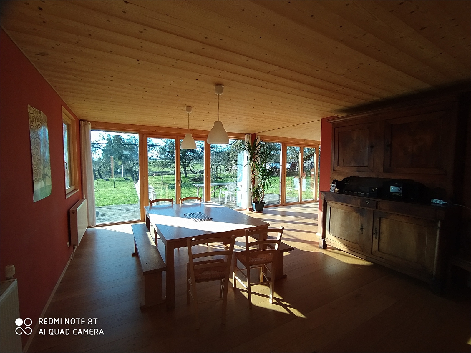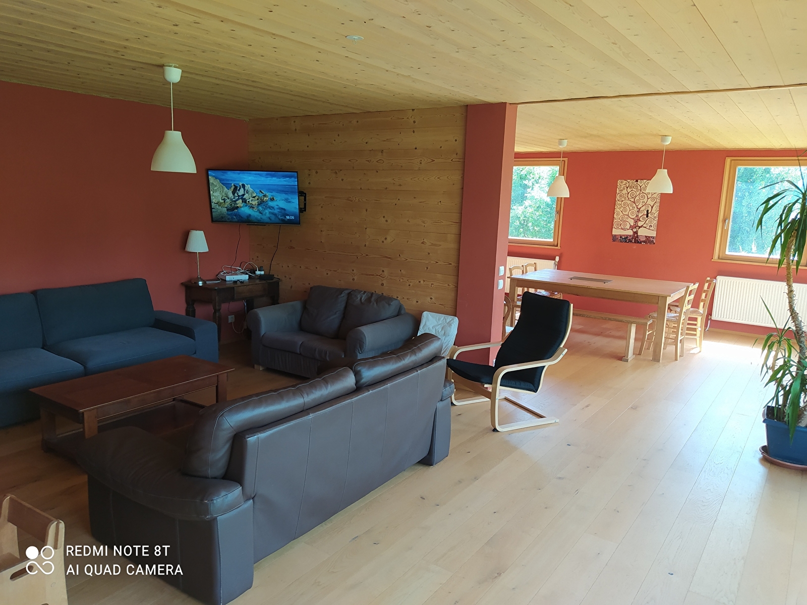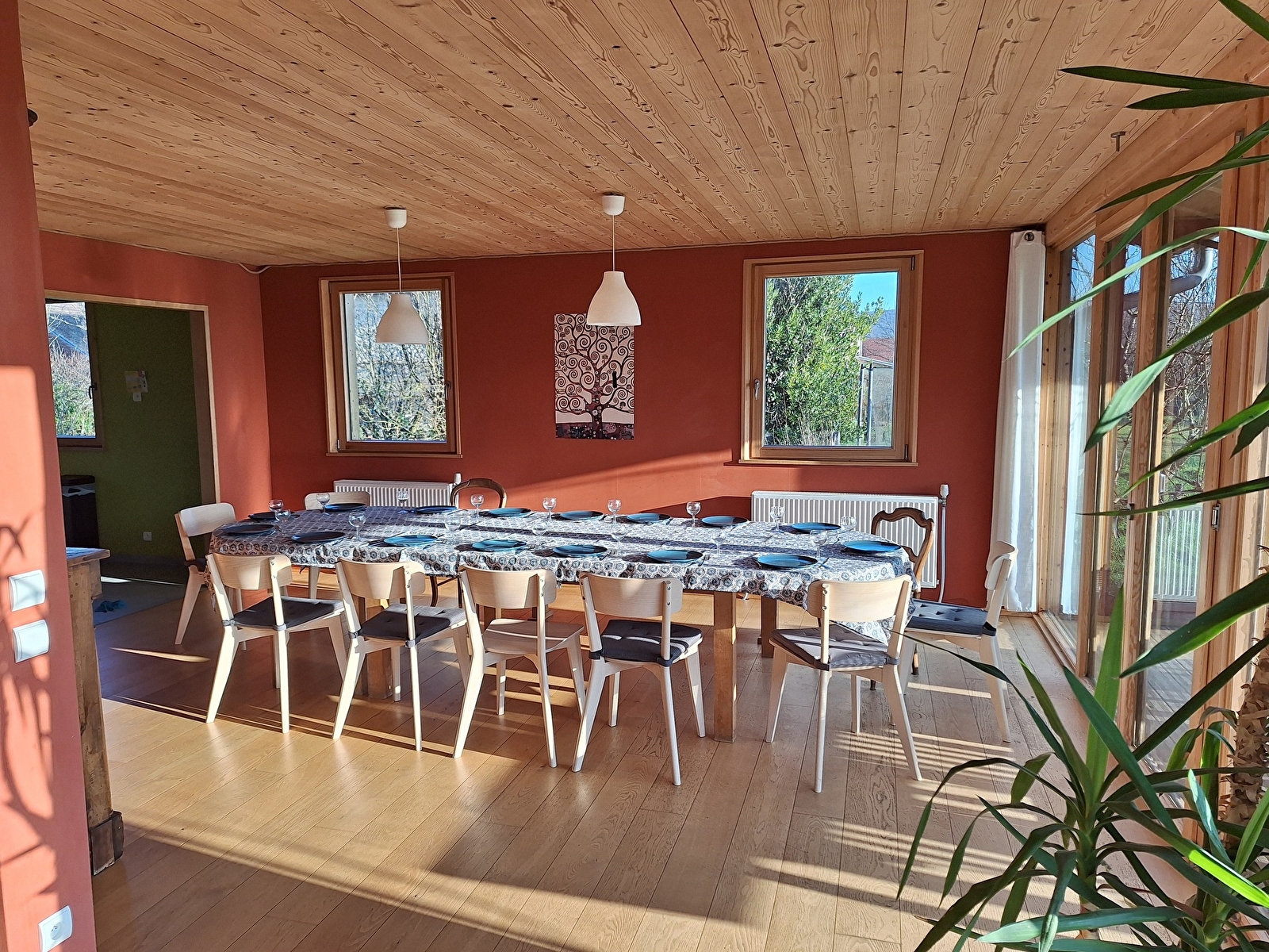Maison indépendante de plain-pied et accessible aux personnes à mobilité réduite, pouvant accueillir 6 à 15 personnes. Cuisine, salle de séjour, salon, 4 grandes chambres et 2 salle de bains/WC handicapé, WC séparé. 2 terrasses. Grand terrain. Accès à la cave salle de jeux avec billard, baby-foot, ping-pong, kaplas... A l'extérieur trampoline, bac à sable, tobogan. Animaux dans le pré.