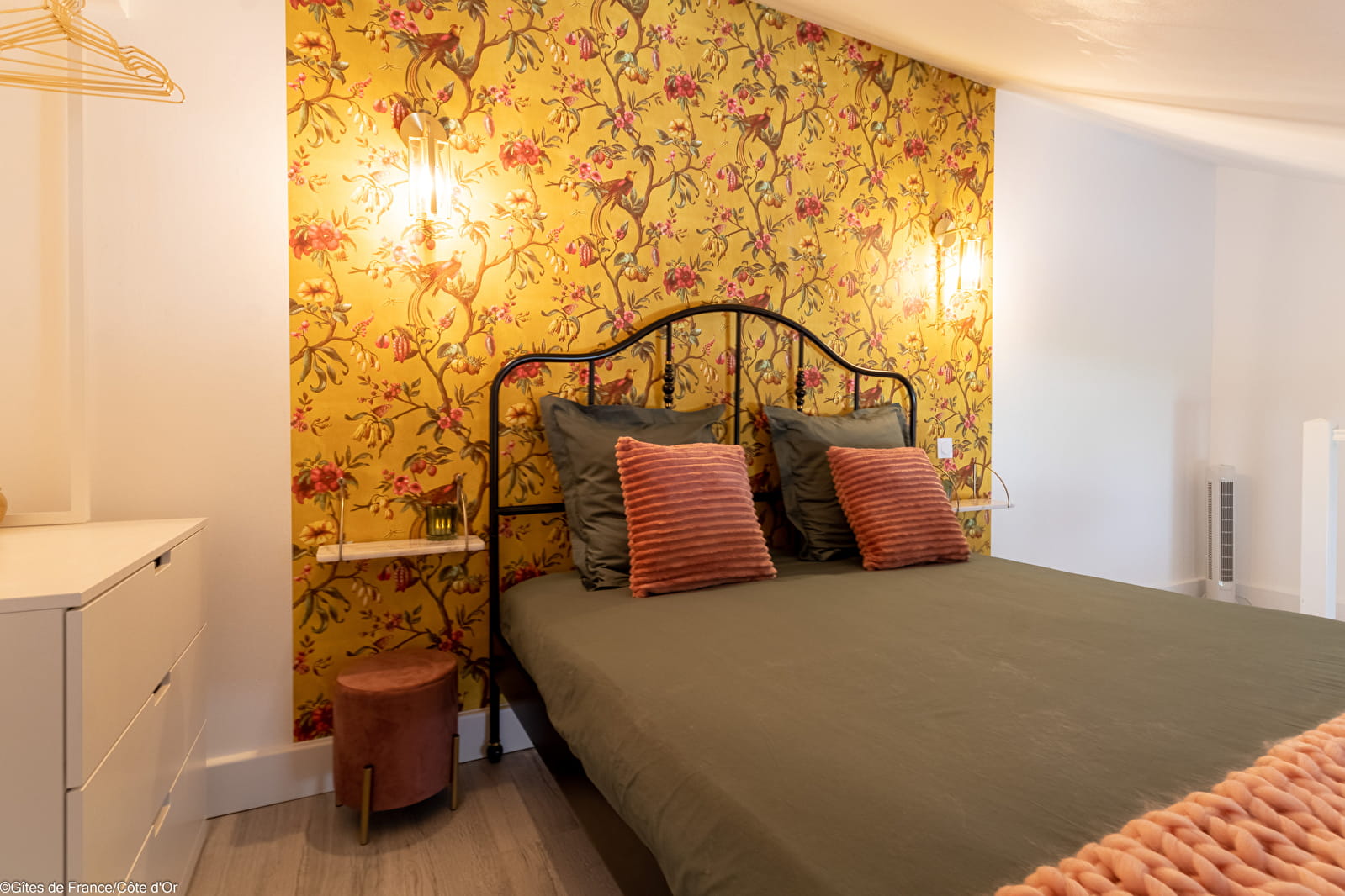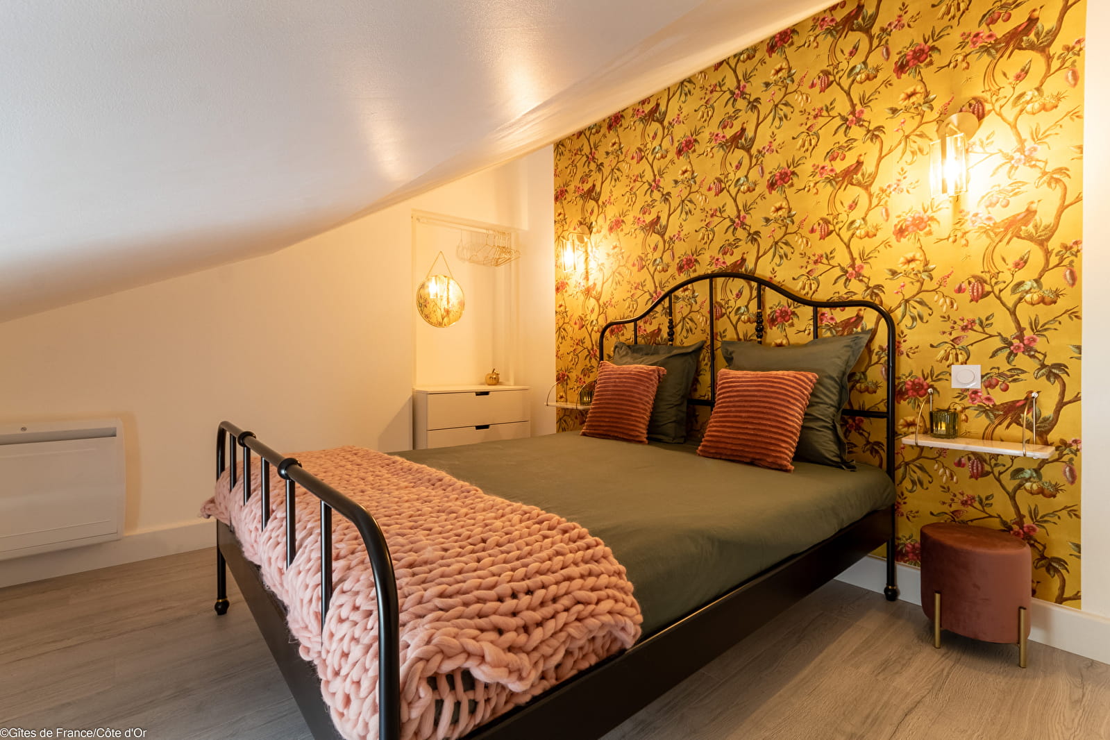 À l'étage, une chambre mansardée à l'ambiance campagne-chic vous attend avec un lit confortable Queen size (160x200) avec dressing.