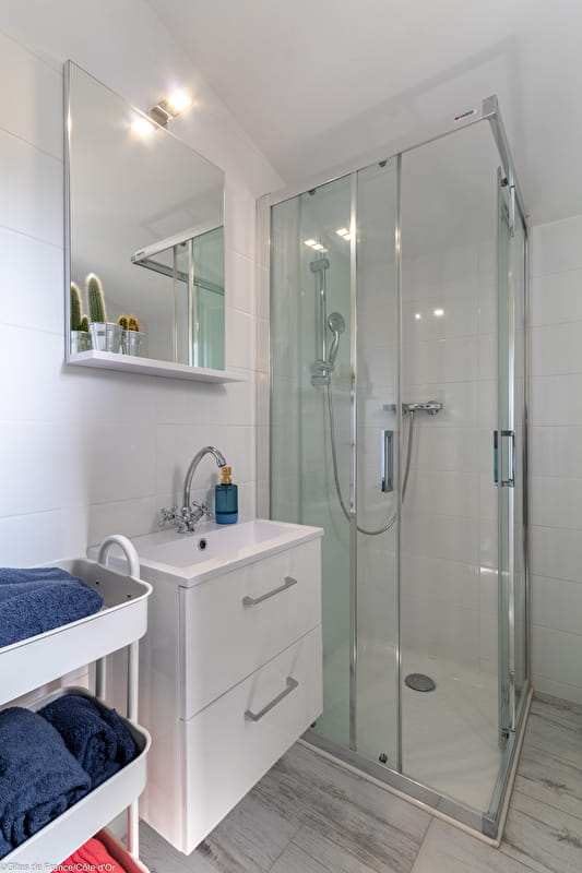 Salle d'eau attenante avec machine à laver, lavabo, douche et WC.