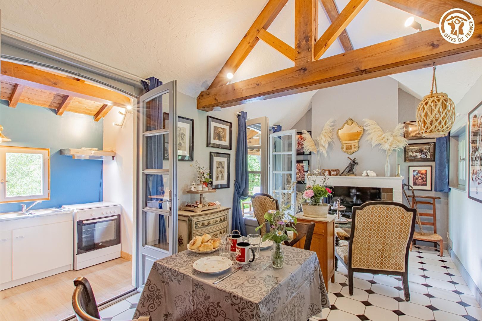 Composition : Maison individuelle jouxtant la demeure des propriétaires et un second gîte (totale indépendance). Plain-pied : cuisine, séjour-salon, chambre (lit 2 p. 160x200cm), salle d'eau (douche/wc). Parking + terrasse couverte + jardin privatifs. Propriété close en commun (8000m²). Commerces dont supermarchés 6 km.