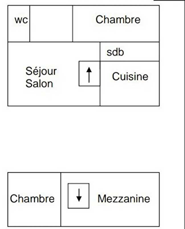 séjour salon, une cuisine, salle d'eau avec douche, une chambre avec un lit double et un wc. À l'étage, une chambre avec lit double et une mezzanine avec deux lits simple. Possibilité de louer au mois de septembre à mai seulement.