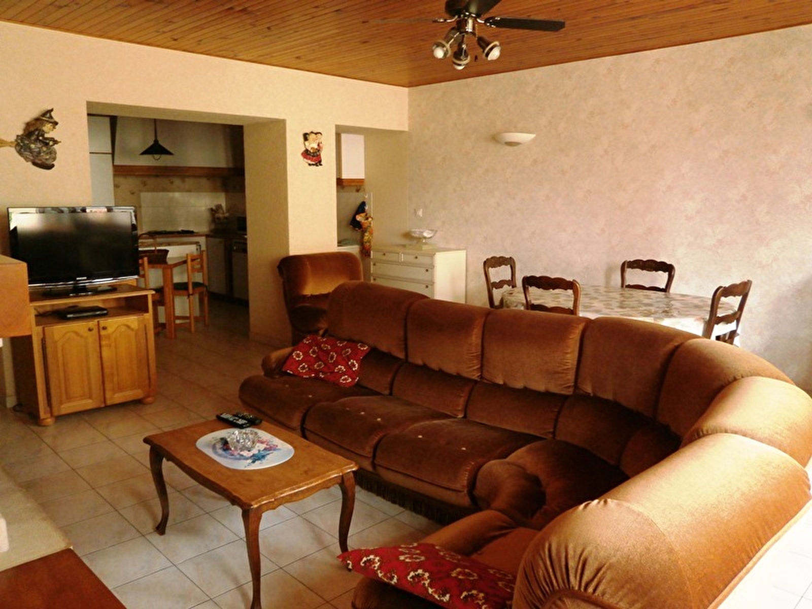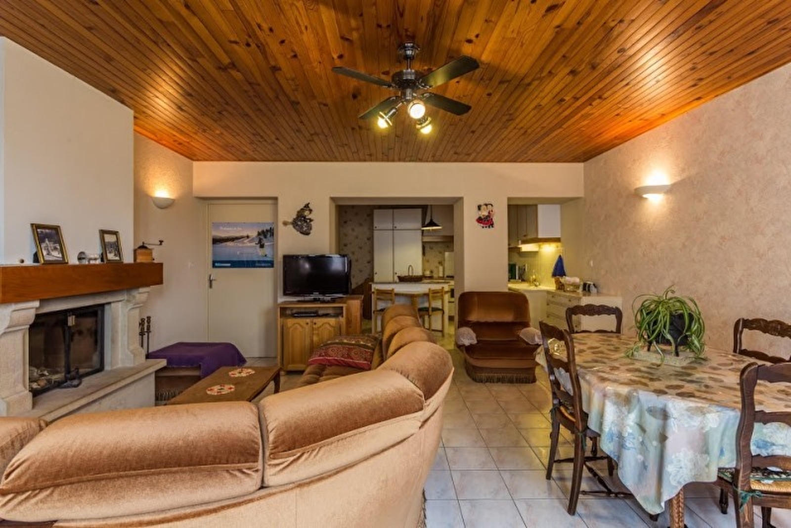 Cuisine américaine aménagée-séjour salon avec cheminée (bois fourni).