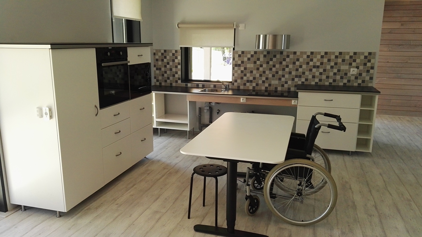Cuisine adaptée à la mobilité réduite avec îlot central électrique.