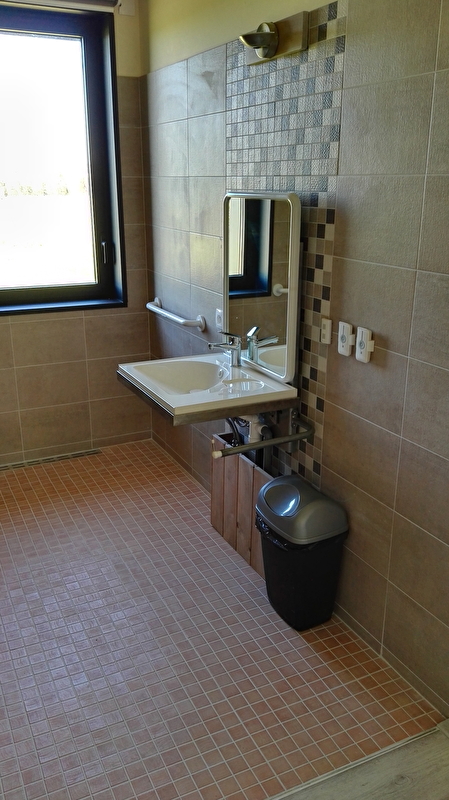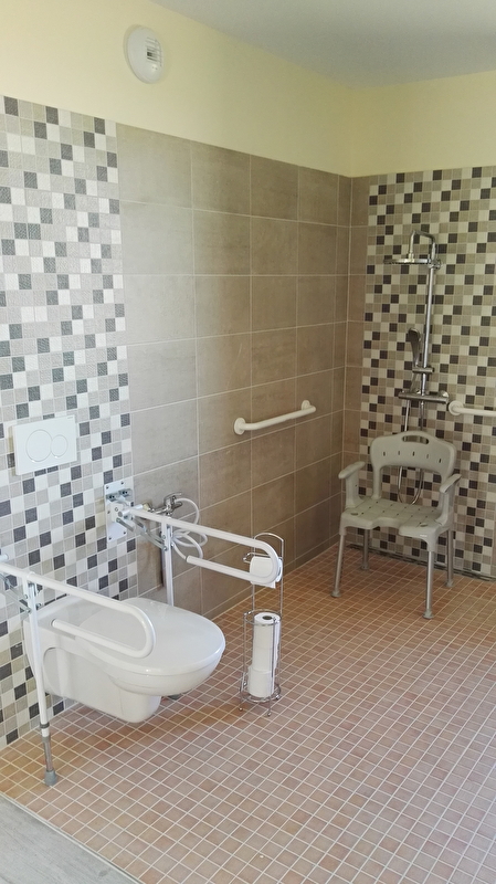 WC handicapé avec bras de maintien de chaque côté, sur demande élévateur de personne électrique.