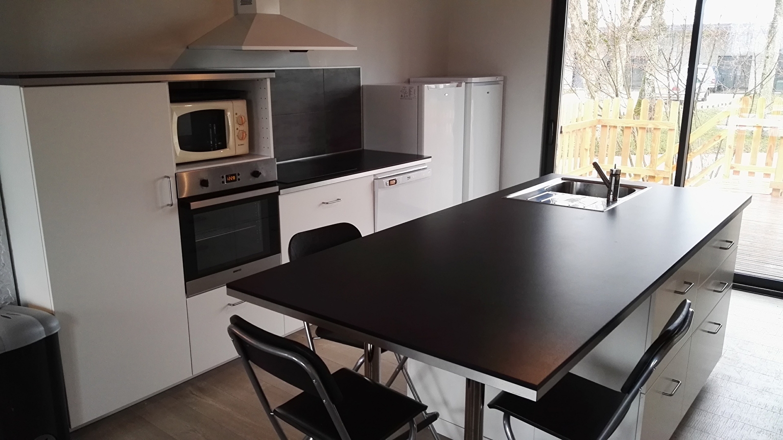 Cuisine adaptée à la mobilité réduite avec îlot central électrique.