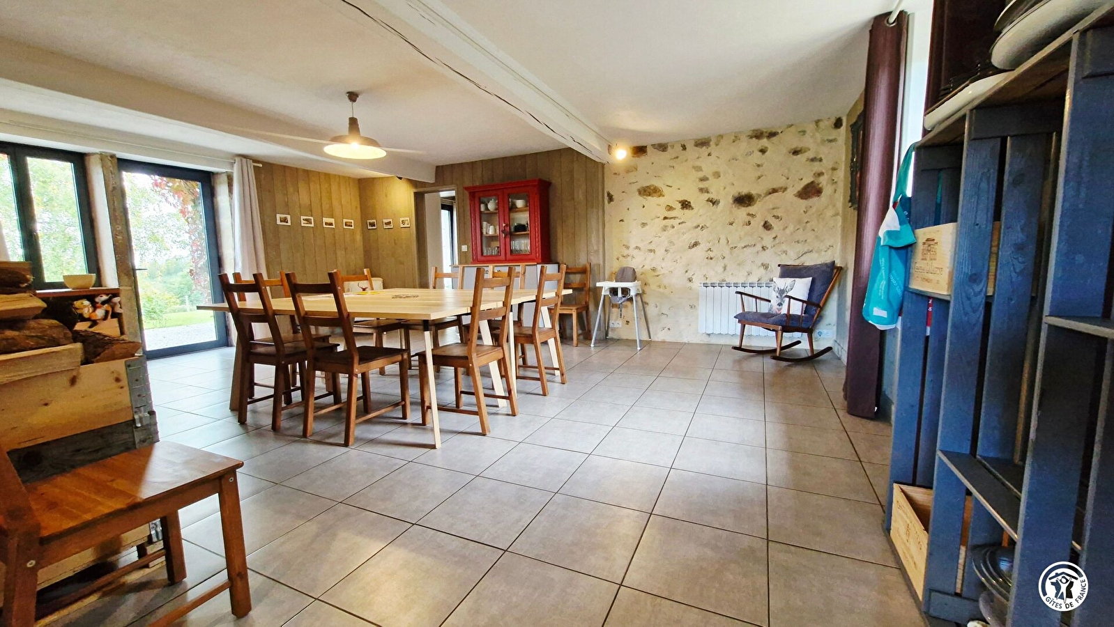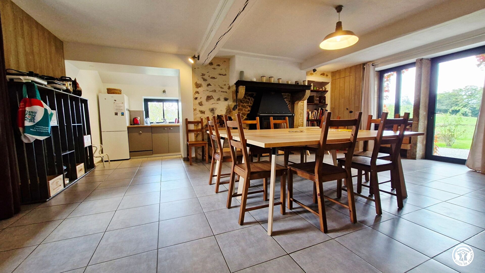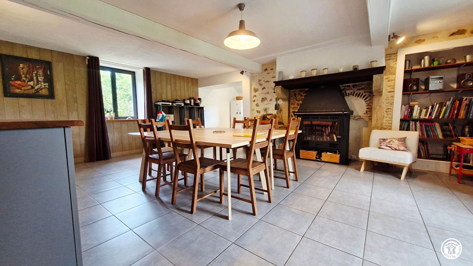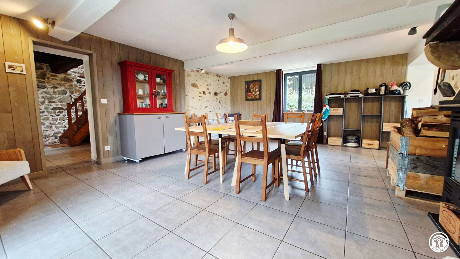 Au rez-de-chaussée :cuisine équipée, grande salle à manger avec poêle à bois, un salon cosy avec poêle à bois et télé, une salle d'eau (douche), wc séparé.