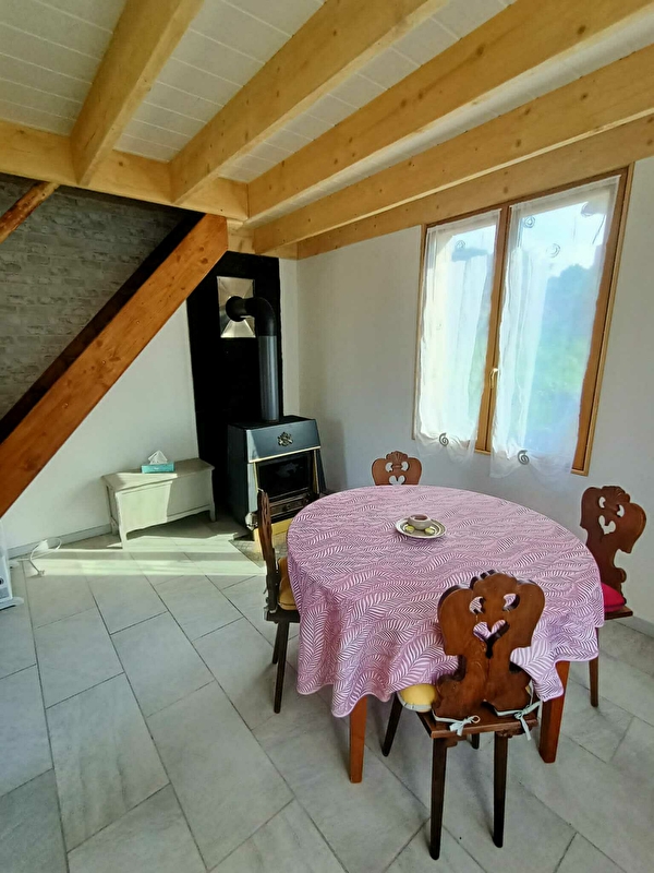 Intérieur chaleureux, chambre intimiste, séjour lumineux ouvrant sur une terrasse ensoleillée à l'entrée d'une petite forêt avec son étang privé et la rivière.