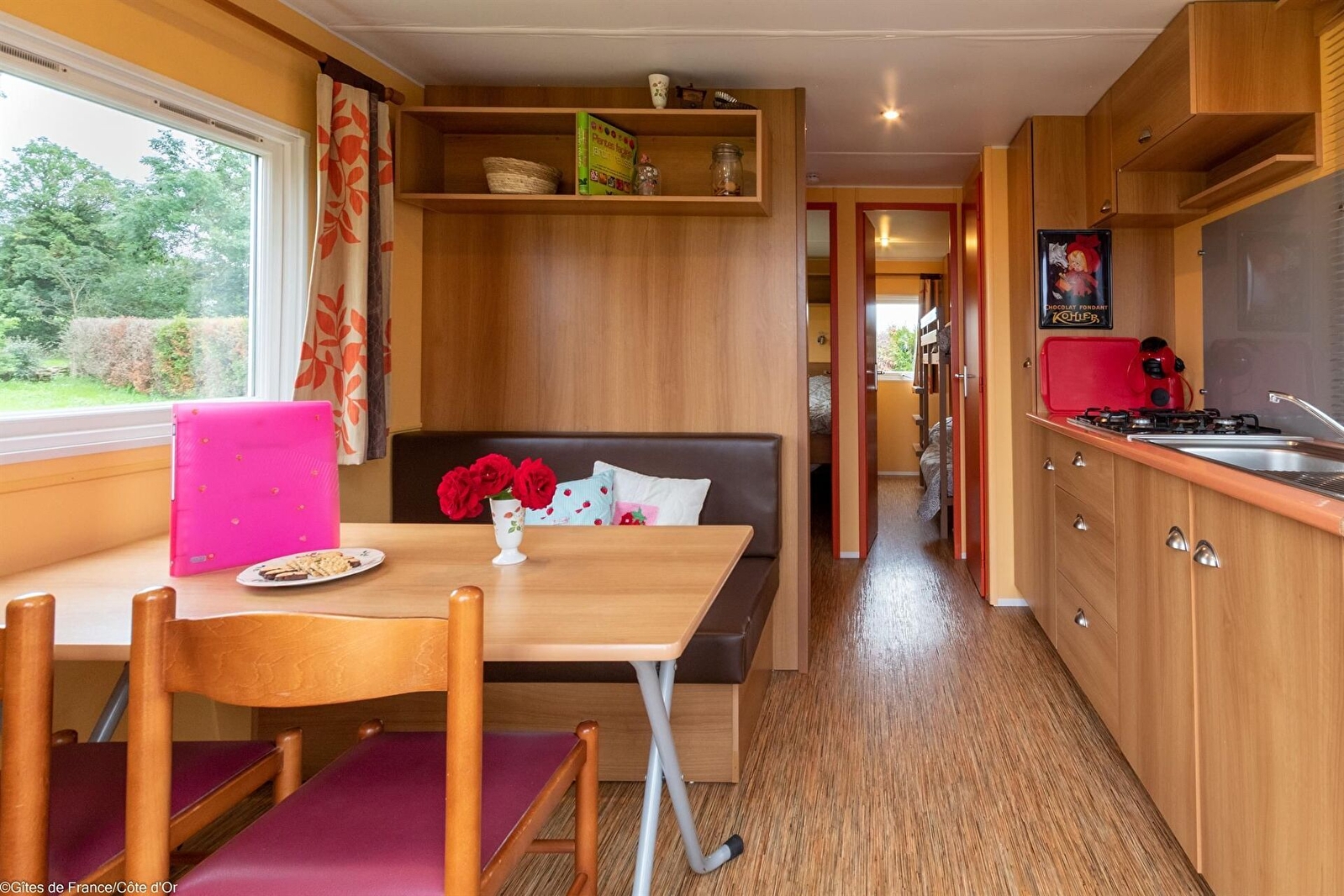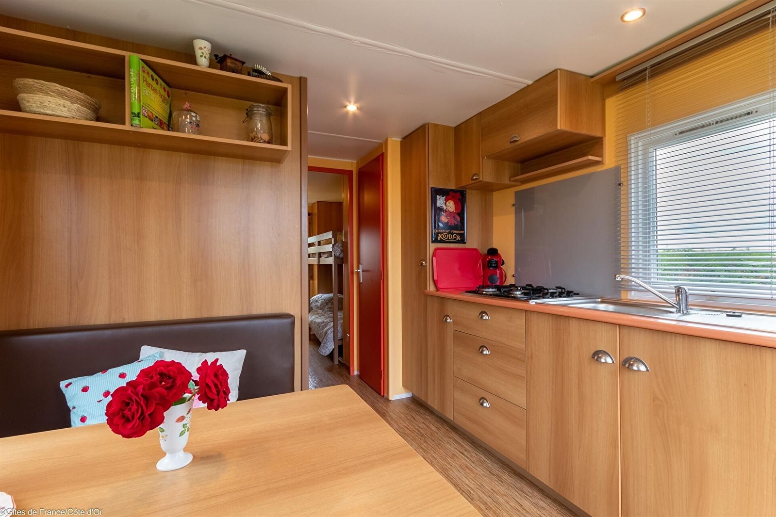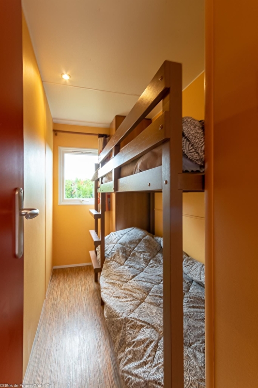 Elles se composent d'une pièce à vivre avec cuisine (4 plaques, micro-ondes, réfrigérateur, congélateur et cafetière) et espace repas TV. Une chambre avec un lit 140 et une chambre avec 2 lits de 80 superposés. Salle d'eau et toilette. Chaise haute et lit parapluie sur demande.