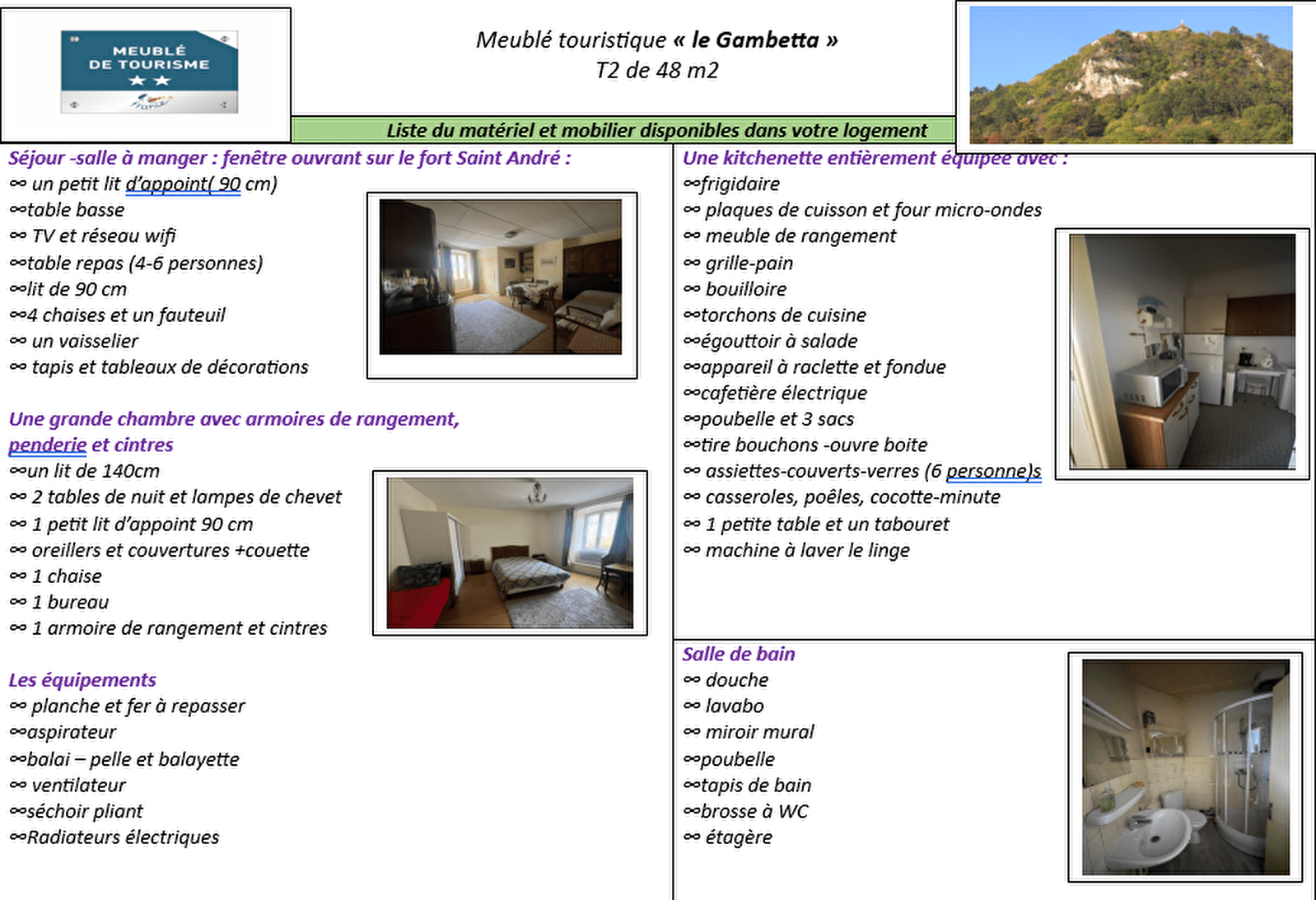 Le meublé « Saint André » est un meublé lumineux pour 3 personnes, avec une vue dégagée sur le fort Saint André. Il est doté d’un séjour spacieux avec un lit d’appoint de 90 cm, d’une vaste chambre avec un lit de 140 cm et des rangements. La Kitchenette est fonctionnelle et bien équipée. Situé au 3ème étage, il est accessible avec un monte escaliers sur les deux premiers niveaux.