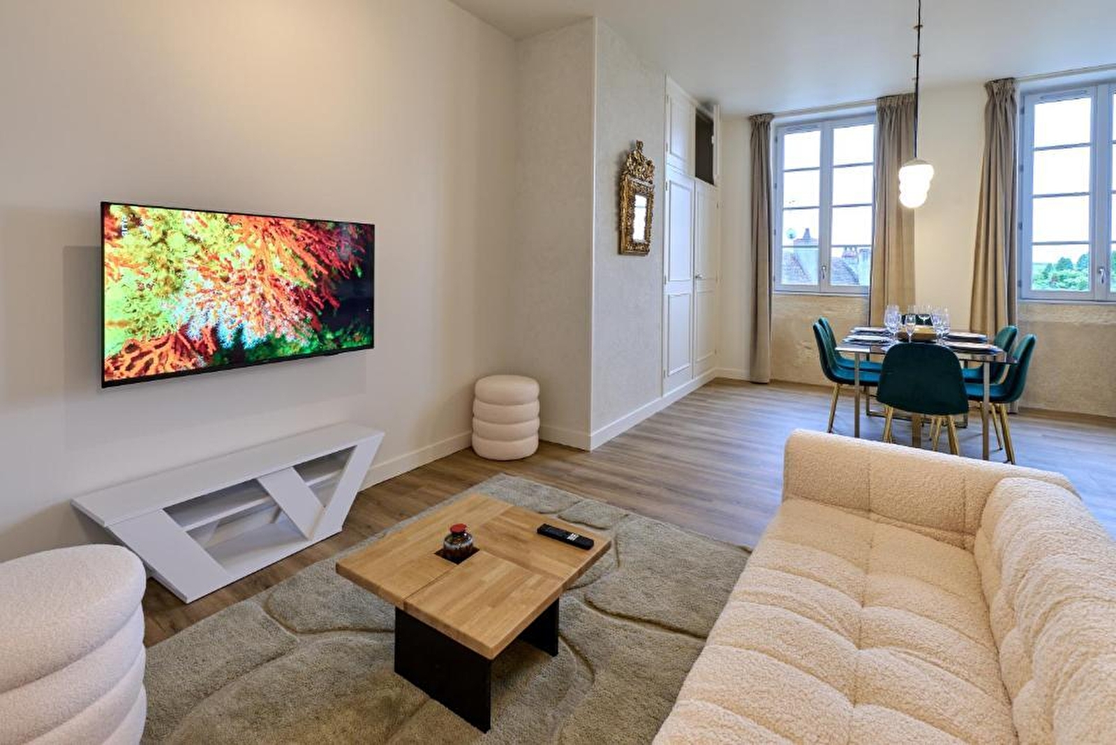 Situé en hyper centre de Nevers, proche de la Cathédrale et du Palais de Justice, dans une résidence privée « Les Suites du Palais » avec parking, ce grand appartement calme et lumineux sera l’endroit parfait pour votre séjour professionnel, en famille, entre amis ou entre collègues !