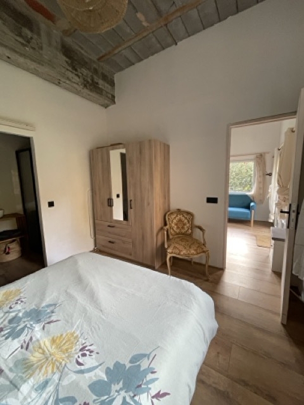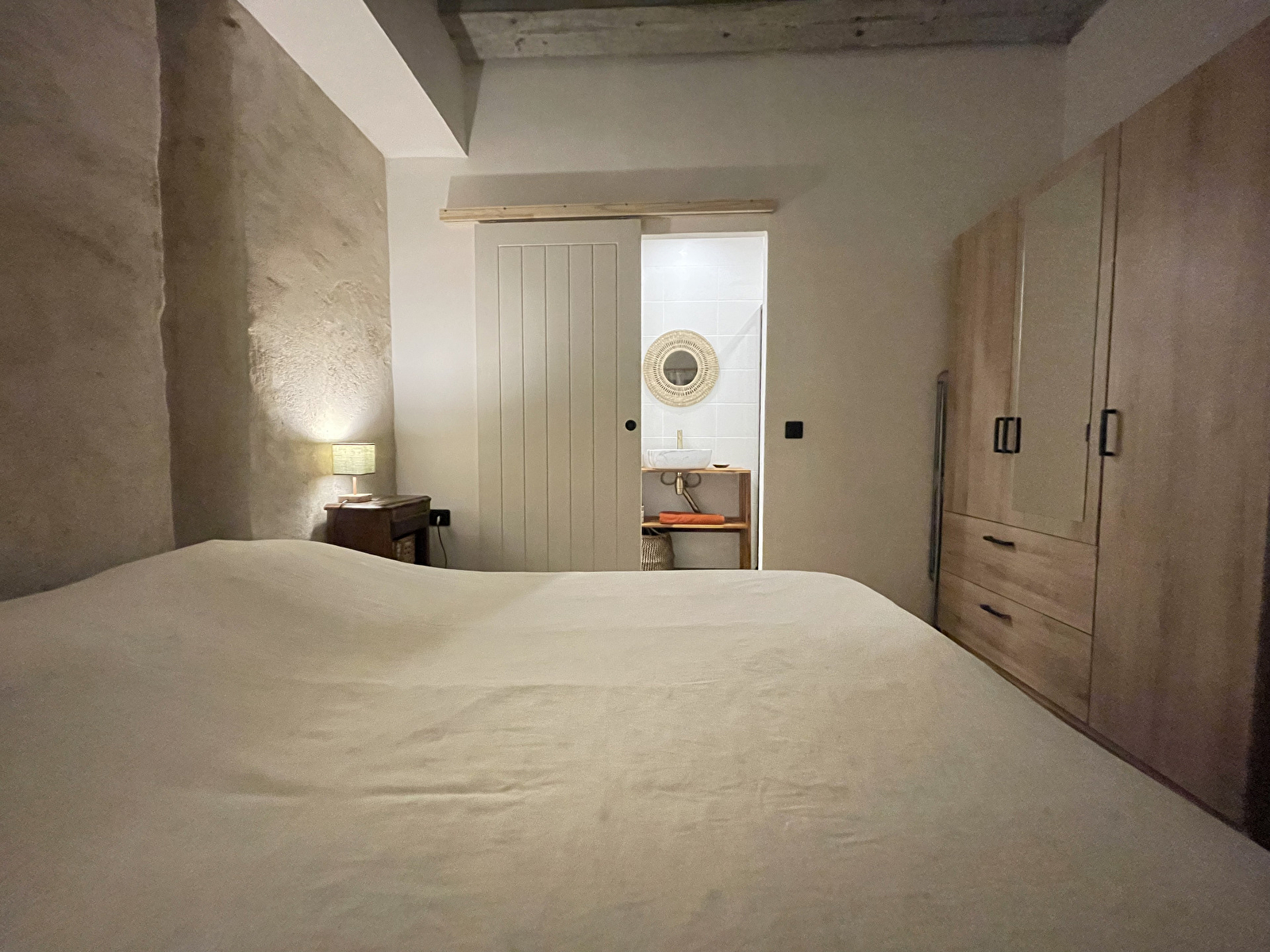 Accès à la chambre depuis le salon. Accès à la S.D. B depuis la chambre.