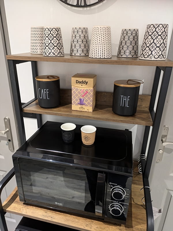 Un cuisine équipée avec une plaque de cuisson, un micro-ondes, un four, un lave-vaisselle ainsi que tout les ustensiles et vaisselles de cuisine.