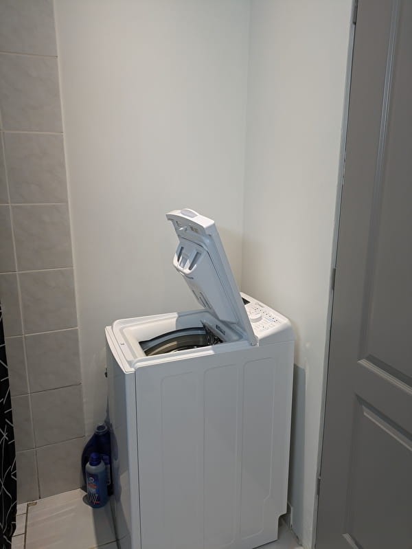 Une salle de bain avec douche a l'italienne et un meuble vasque, machine à laver et un WC .