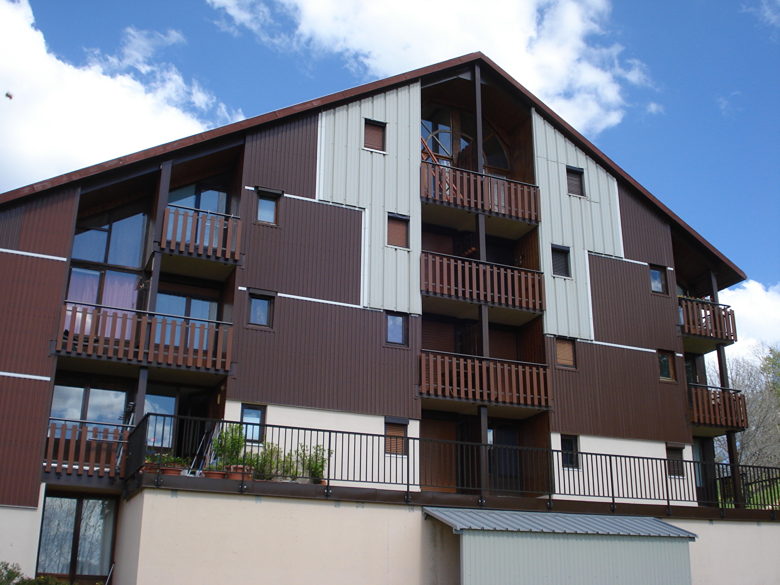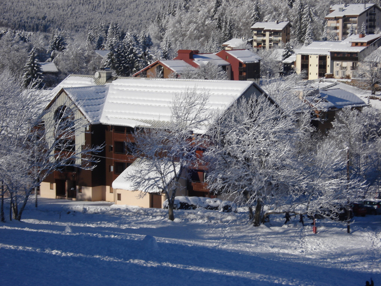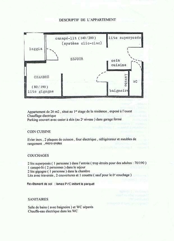 Studio au 1er étage d'une résidence calme, proche du village et des pistes de ski de fond, avec balcon à l'Ouest, entrée (coin cuisine), séjour (clic-clac 2 personnes), coin chambre (petite fenêtre, 2 lits de 1 pers.). WC, salle de bains séparés. Place de parking couvert.