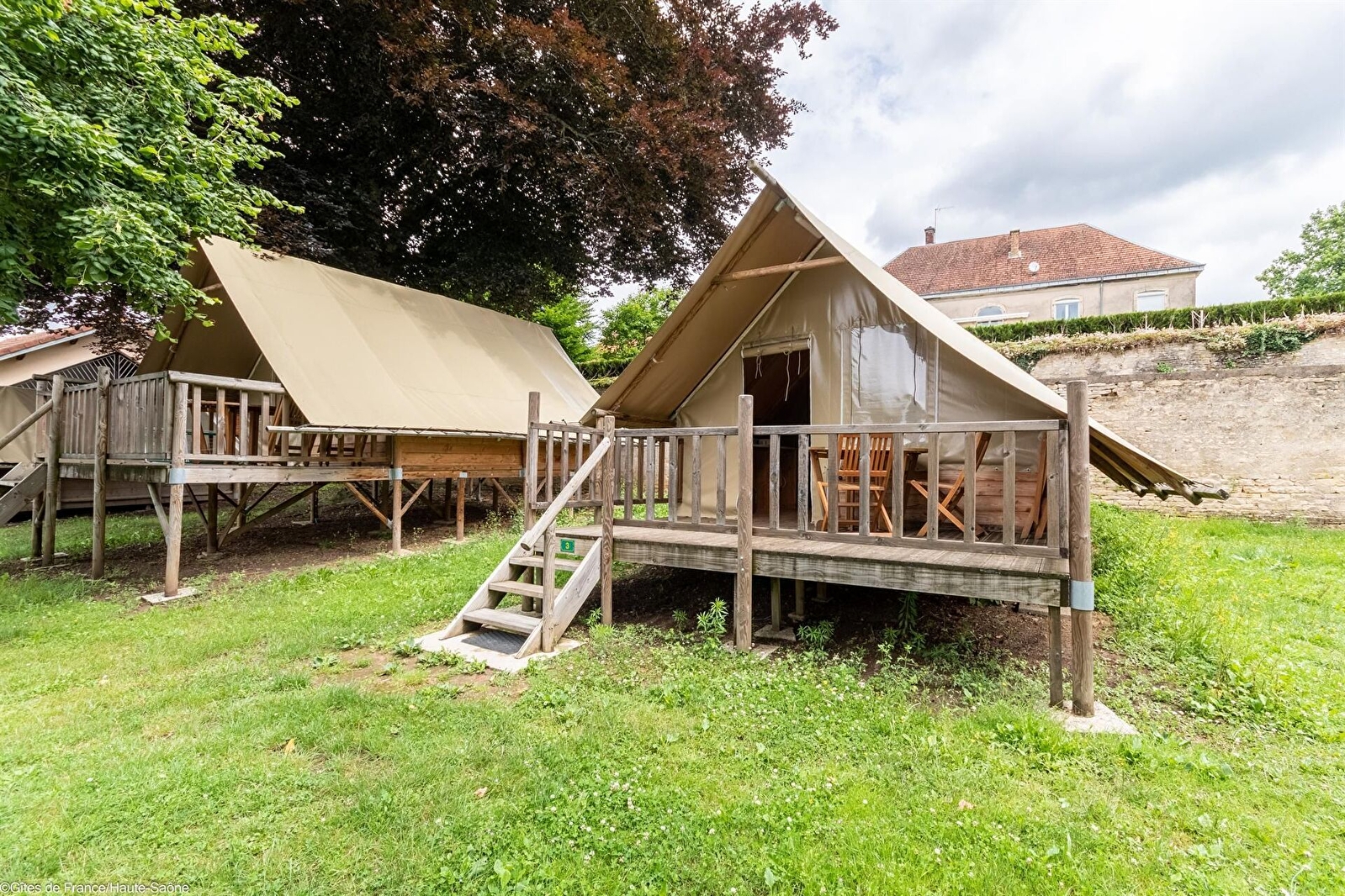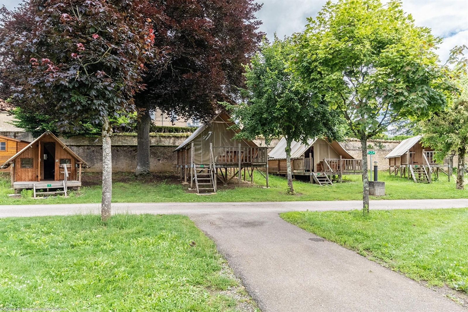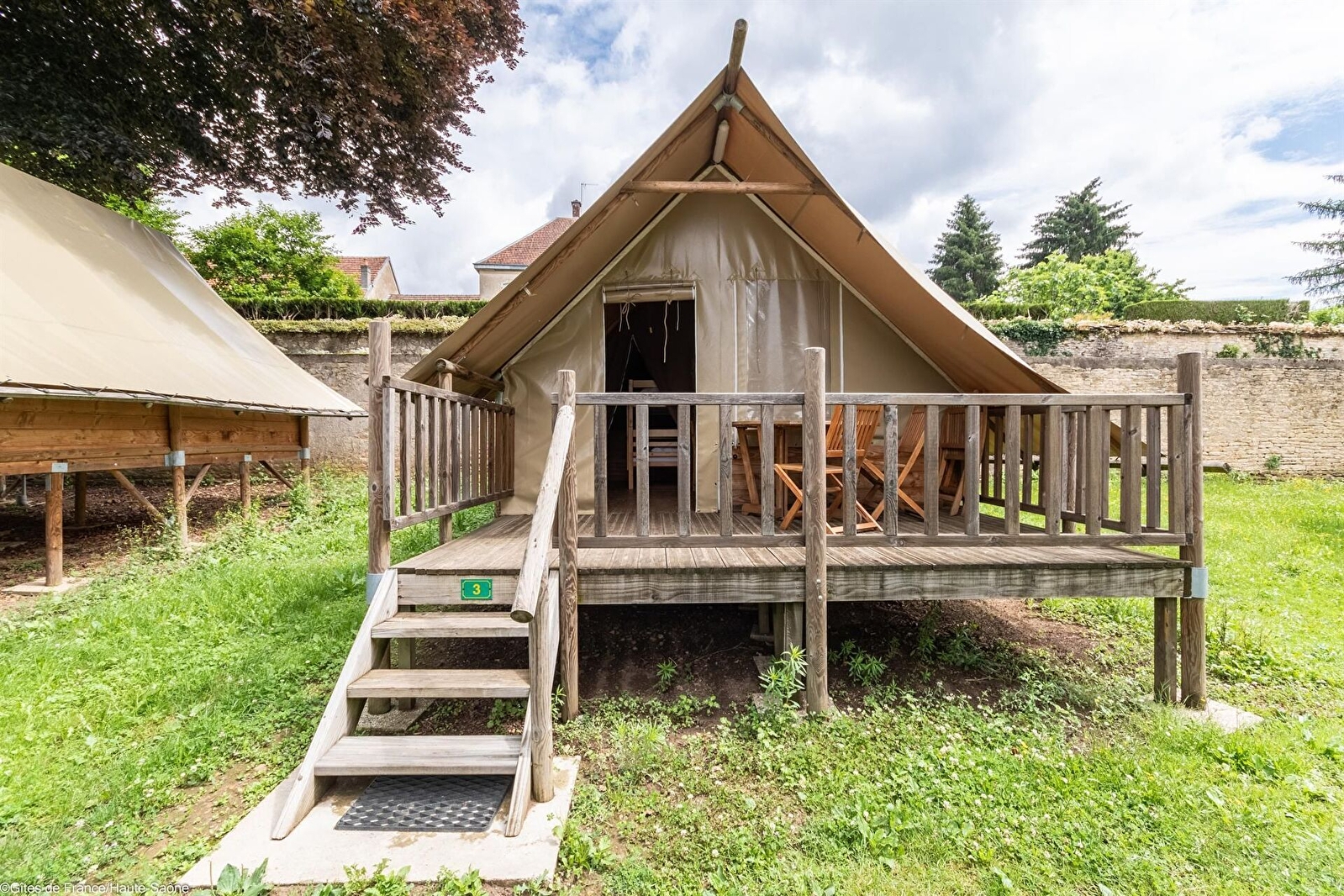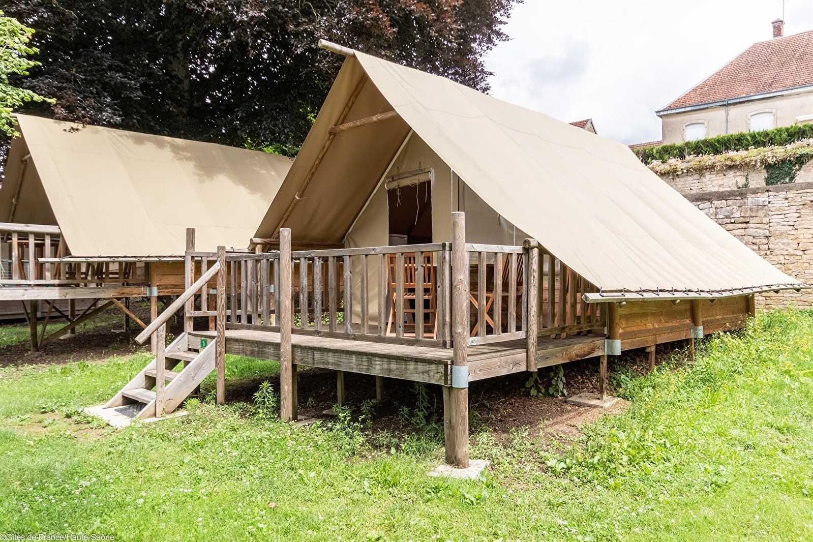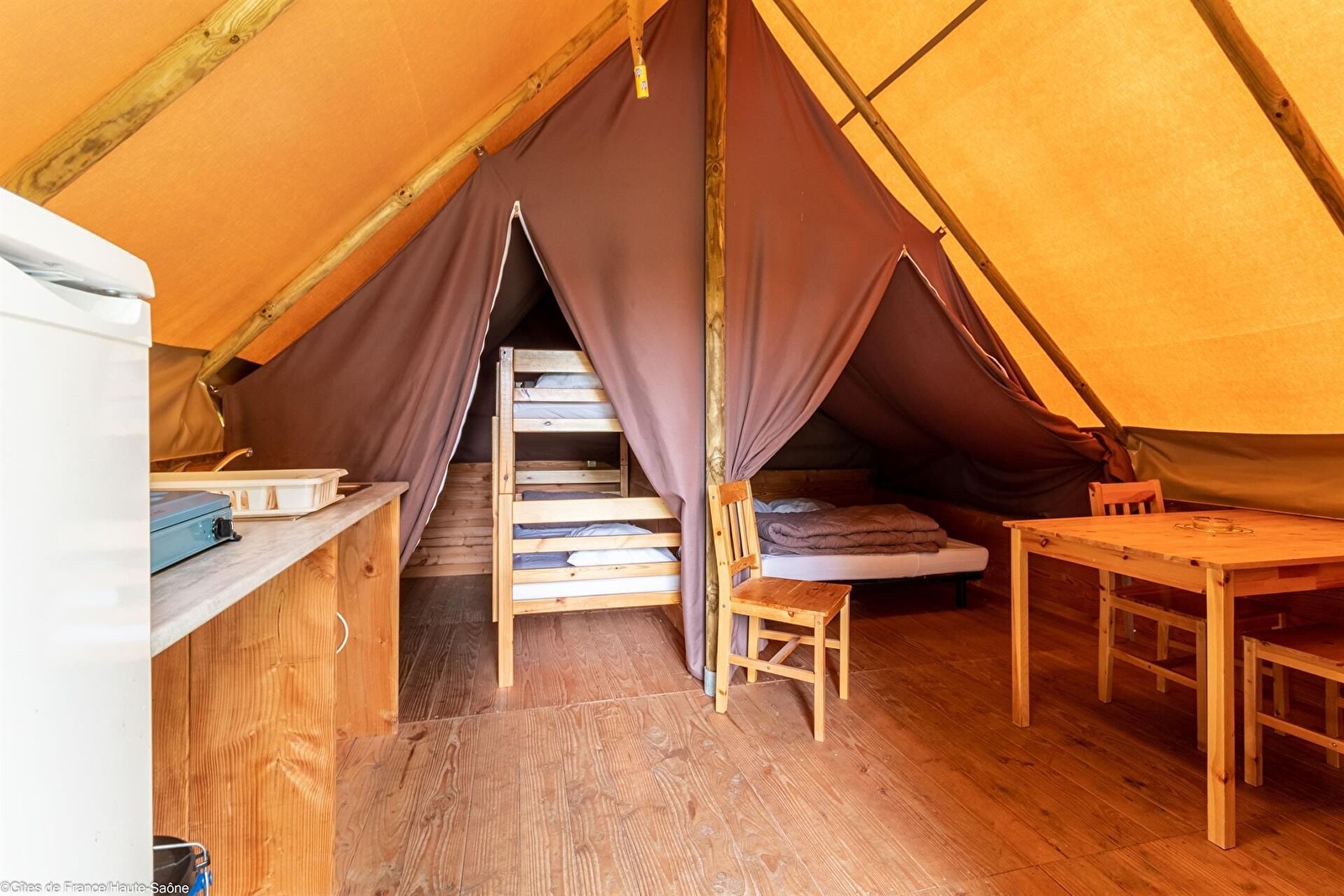 La tente amazone (N°3 -3 marches) équipée pour 4 personnes, contient 1 pièce à vivre avec 1 coin cuisine (1 table, 4 chaises, 1 réchaud gaz ou électrique, 1 petit réfrigérateur, 1 desserte, 1 kit vaisselle, 1 évier, 1 cafetière), 1 chambre avec 2 lits superposés et 1 chambre avec 1 lit de 140 x 190 cm. La terrasse en bois de 9m² est semi couverte et dispose d'une table de jardin et 4 chaises. En commun : 2 blocs sanitaires (douches, lavabos, éviers, WC, bac à linge...). Wifi payante : 1€ les 12h. ACCUEIL AVANT 19H30.
