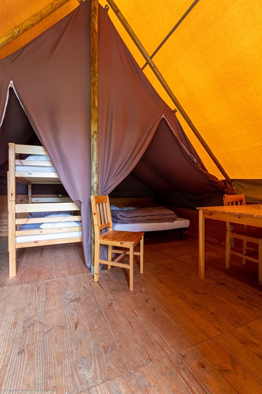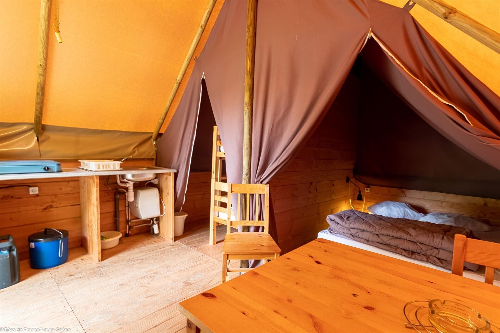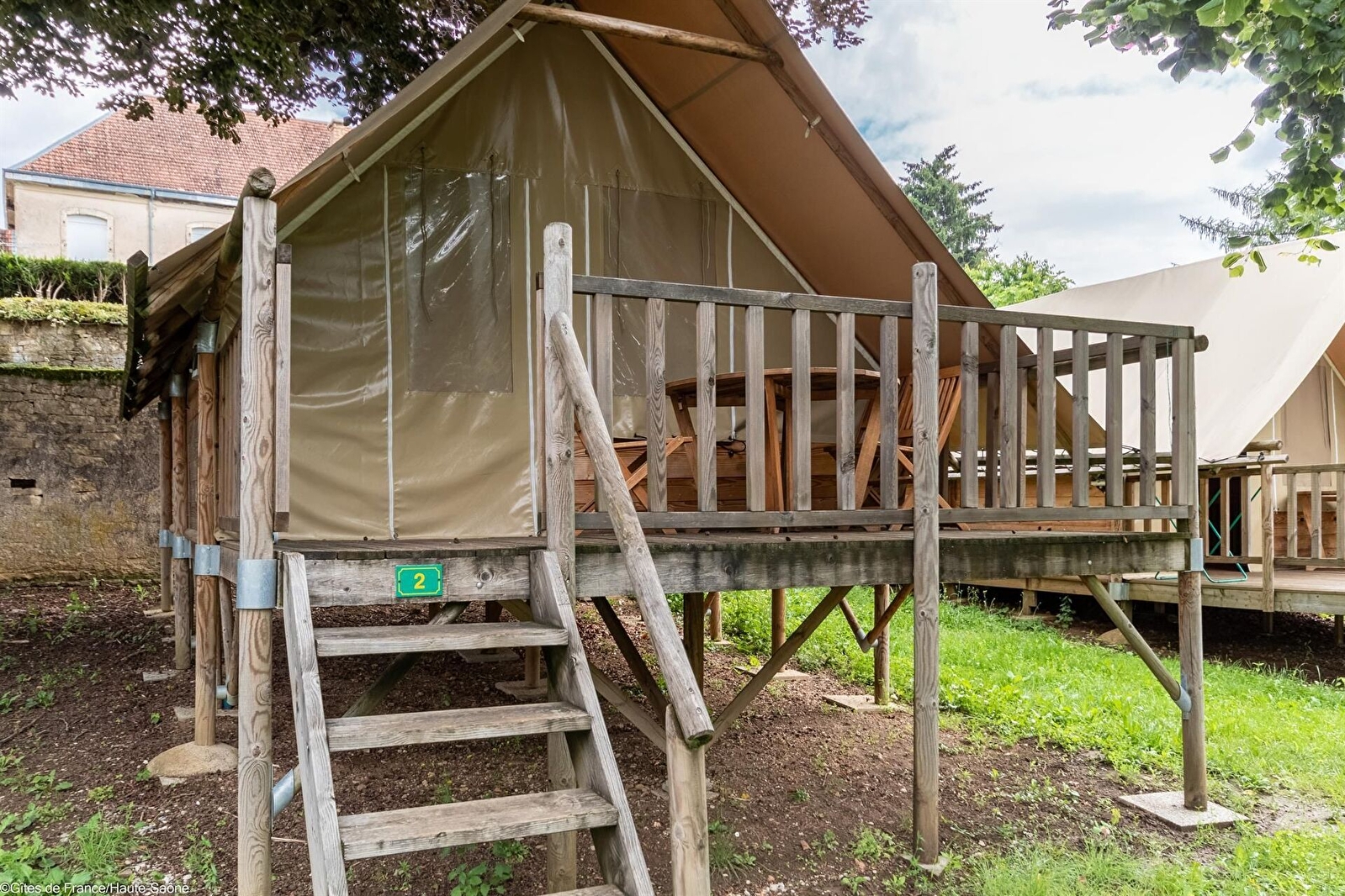 Dans le camping de la Saône jolie (50 emplacements) situé à Scey-Sur-Saône, venez découvrir un concept innovant tout confort : 4 tentes mixtes bois et toile. Un cadre idyllique au coeur de la Vallée de la Saône, admirez les bateaux de plaisances, profitez des chemins de halage pour de délicieuses balades, savourez les produits régionaux lors les marchés de pays et découvrez le riche patrimoine au cours des nombreuses visites organisées par l'office de tourisme. Amoureux de la nature et de la convivialité, ce petit coin de paradis est fait pour vous. Les pêcheurs auront un vaste terrain de jeux pour taquiner le poisson, la Saône est en bordure du camping. Possibilité de louer des vélos sur place. À faire : location de bateaux sans permis. Dans le bourg, en été : piscine découverte avec toboggans, espace ludique, bains à bulles. La tente amazone (N°2 sur pilotis 5 marches) équipée pour 4 personnes, contient 1 pièce à vivre avec 1 coin cuisine (1 table, 4 chaises, 1 réchaud gaz ou électrique, 1 petit réfrigérateur, 1 desserte, 1 kit vaisselle, 1 évier, 1 cafetière), 1 chambre avec 2 lits superposés et 1 chambre avec 1 lit de 140X190cm. La terrasse en bois de 9 m² est semi couverte et dispose d'une table de jardin et 4 chaises. En commun : 2 blocs sanitaires (douches, lavabos, éviers, wc, bac à linge...). Wifi payante : 1 € les 12 h ou 10 €/semaine. ACCUEIL AVANT 19H30.