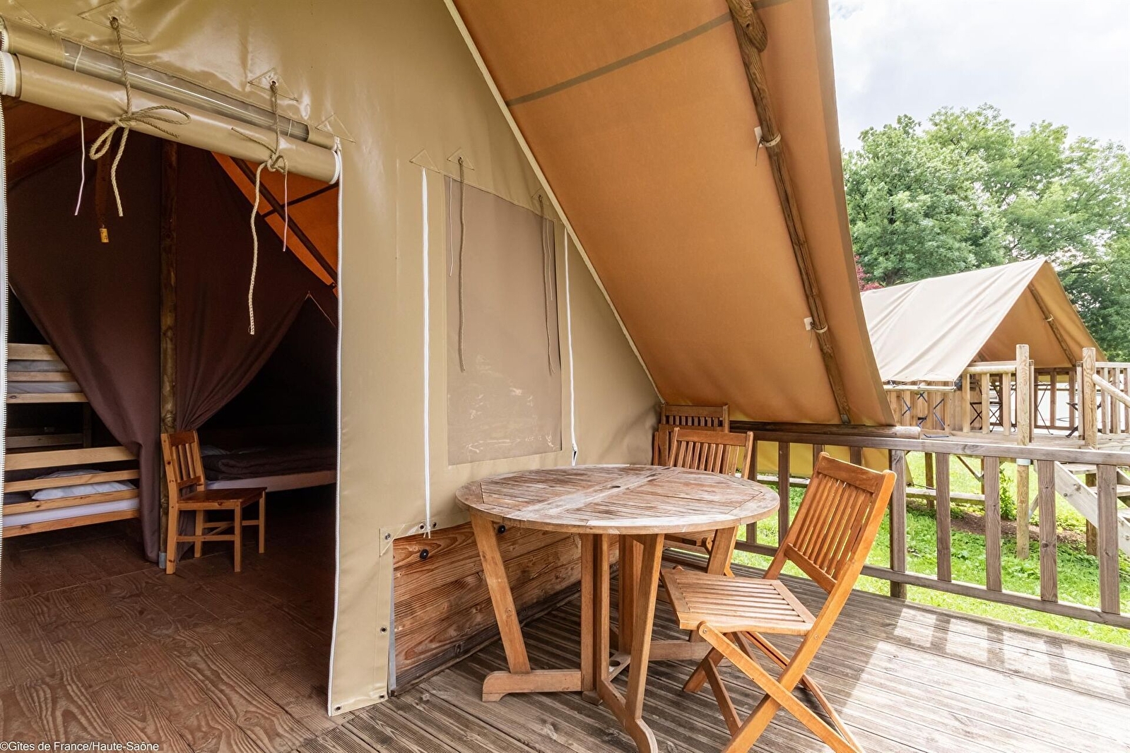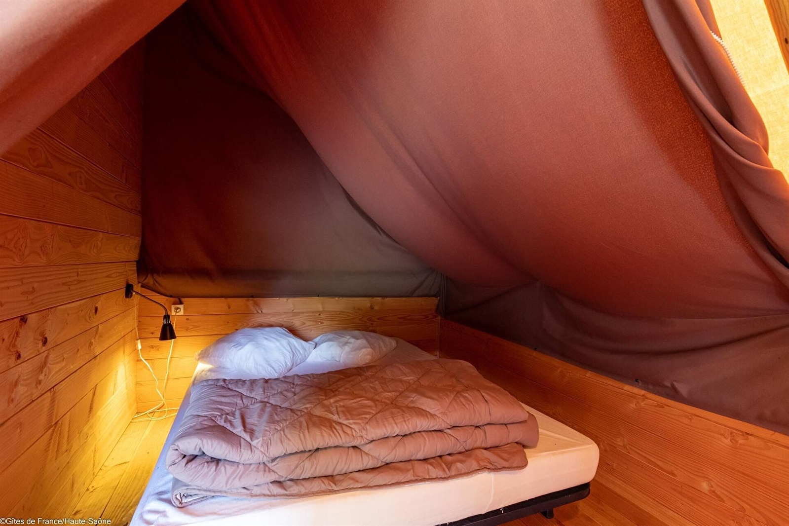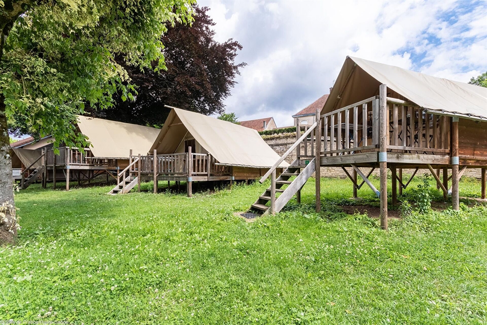 Dans le camping de la Saône jolie (50 emplacements) situé à Scey-Sur-Saône, venez découvrir un concept innovant tout confort : 4 tentes mixtes bois et toile. Un cadre idyllique au coeur de la Vallée de la Saône, admirez les bateaux de plaisances, profitez des chemins de halage pour de délicieuses balades, savourez les produits régionaux lors les marchés de pays et découvrez le riche patrimoine au cours des nombreuses visites organisées par l'office de tourisme. Amoureux de la nature et de la convivialité, ce petit coin de paradis est fait pour vous. Les pêcheurs auront un vaste terrain de jeux pour taquiner le poisson, la Saône est en bordure du camping. Possibilité de louer des vélos sur place. À faire : location de bateaux sans permis. Dans le bourg, en été : piscine découverte avec toboggans, espace ludique, bains à bulles. La tente amazone (N°2 sur pilotis 5 marches) équipée pour 4 personnes, contient 1 pièce à vivre avec 1 coin cuisine (1 table, 4 chaises, 1 réchaud gaz ou électrique, 1 petit réfrigérateur, 1 desserte, 1 kit vaisselle, 1 évier, 1 cafetière), 1 chambre avec 2 lits superposés et 1 chambre avec 1 lit de 140X190cm. La terrasse en bois de 9 m² est semi couverte et dispose d'une table de jardin et 4 chaises. En commun : 2 blocs sanitaires (douches, lavabos, éviers, wc, bac à linge...). Wifi payante : 1 € les 12 h ou 10 €/semaine. ACCUEIL AVANT 19H30.