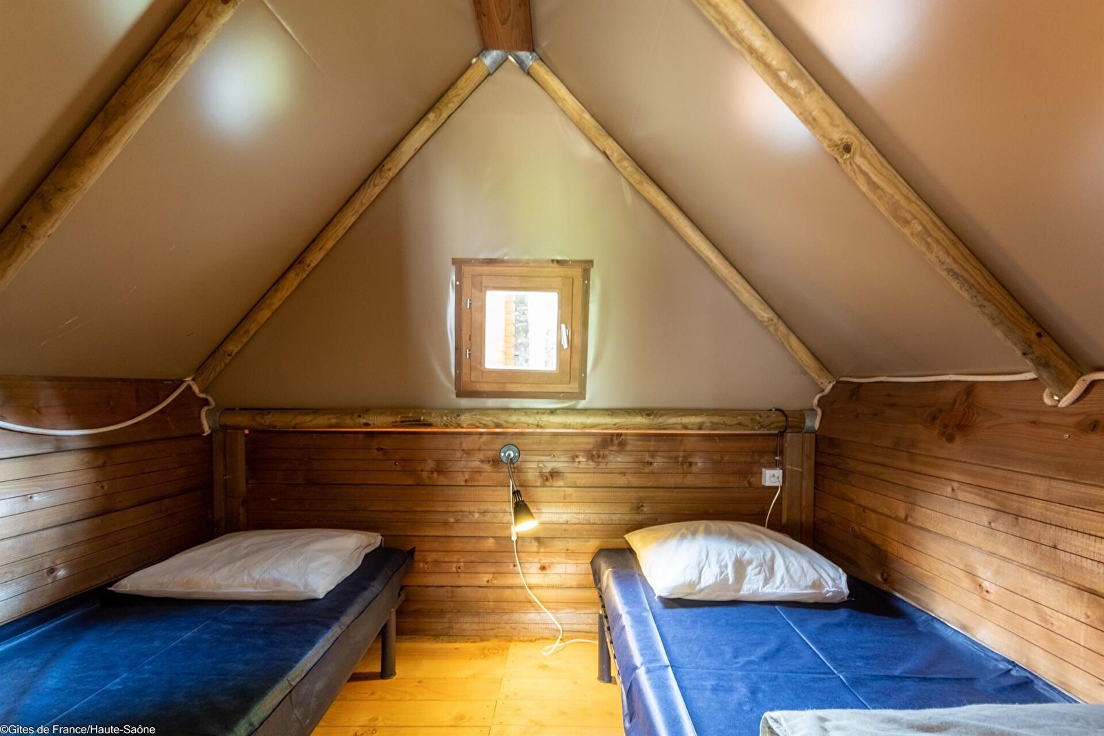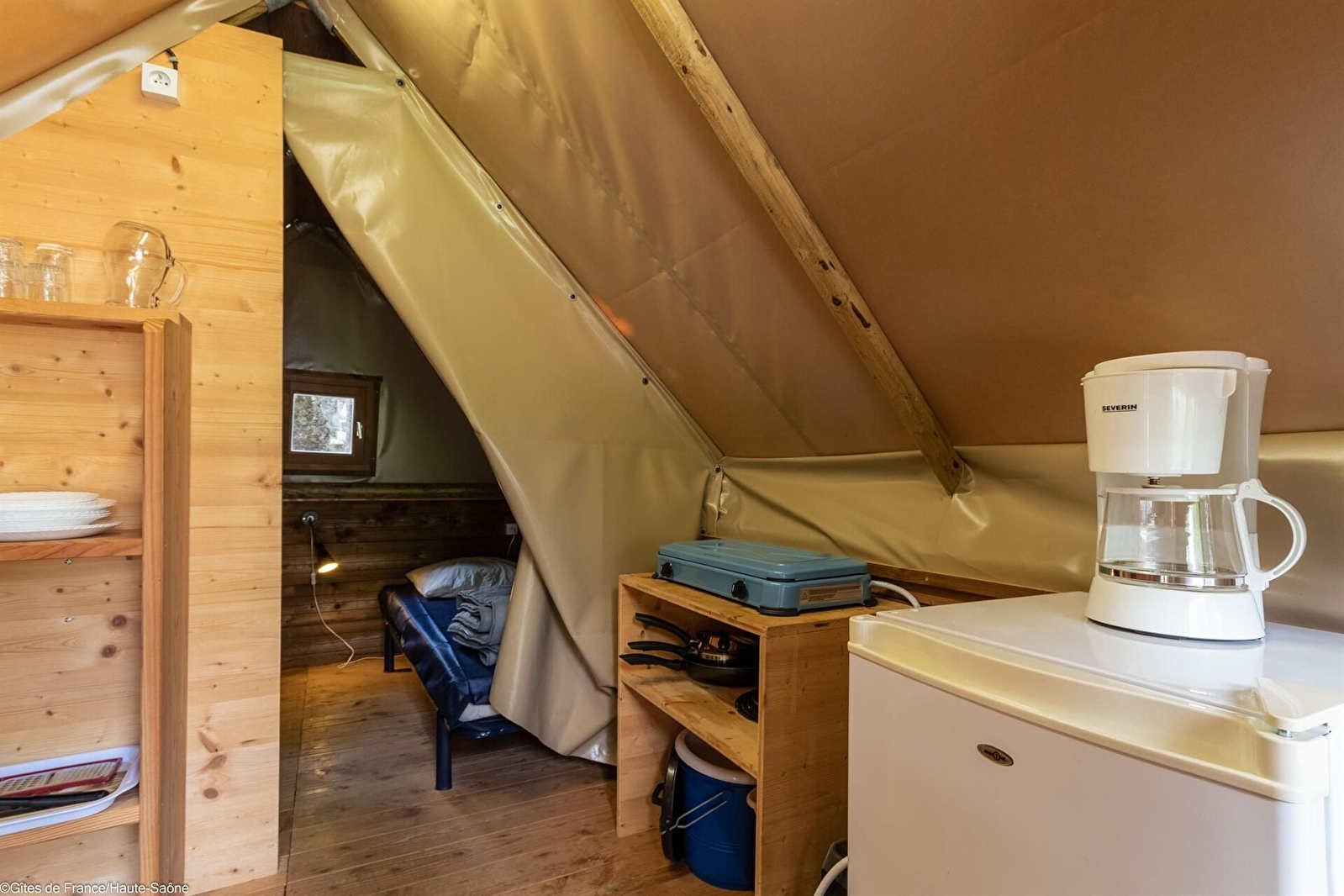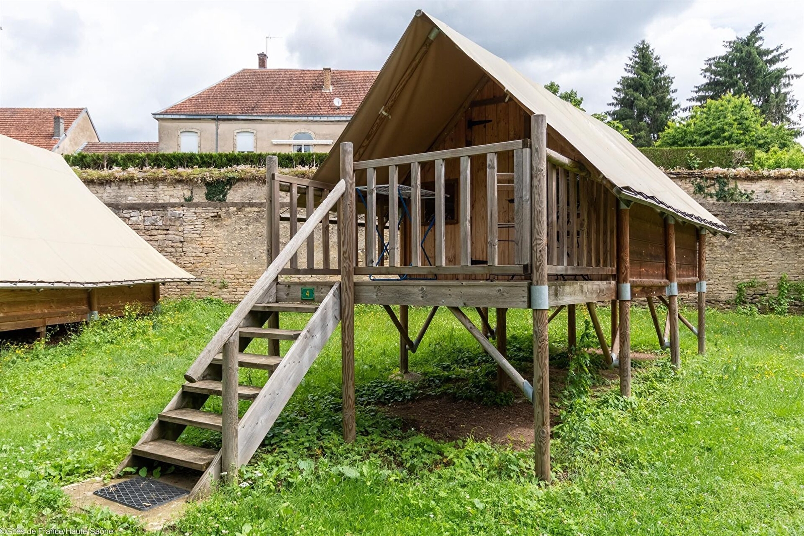 Dans le camping de la Saône jolie (50 emplacements) situé à Scey-Sur-Saône, venez découvrir un concept innovant tout confort : 4 tentes mixtes bois et toile. Un cadre idyllique au coeur de la Vallée de la Saône, admirez les bateaux de plaisance, profitez des chemins de halage pour de délicieuses balades, savourez les produits régionaux lors les marchés de pays et découvrez le riche patrimoine au cours des nombreuses visites organisées par l'office de tourisme. Amoureux de la nature et de la convivialité, ce petit coin de paradis est fait pour vous. Les pêcheurs auront un vaste terrain de jeux pour taquiner le poisson, la Saône est en bordure du camping. Possibilité de louer des vélos sur place. À faire : location de bateaux sans permis. Dans le bourg, en été: piscine découverte avec toboggans, espace ludique, bains à bulles. Tente Mini Canadienne sur Pilotis (N°4-6 marches) est équipée pour 2 personnes, elle contient 1 espace repas avec 1 table et 2 chaises, 1 réchaud gaz, 1 petit réfrigérateur, 1 chambre avec 2 lits 80. La terrasse en bois de 3m² est semi couverte. En commun : 2 blocs sanitaires (douches, lavabos, éviers, WC, bac à linge...). Wifi payante : 1 € les 12h. ou 10 €/semaine. ACCUEIL AVANT 19H30.
