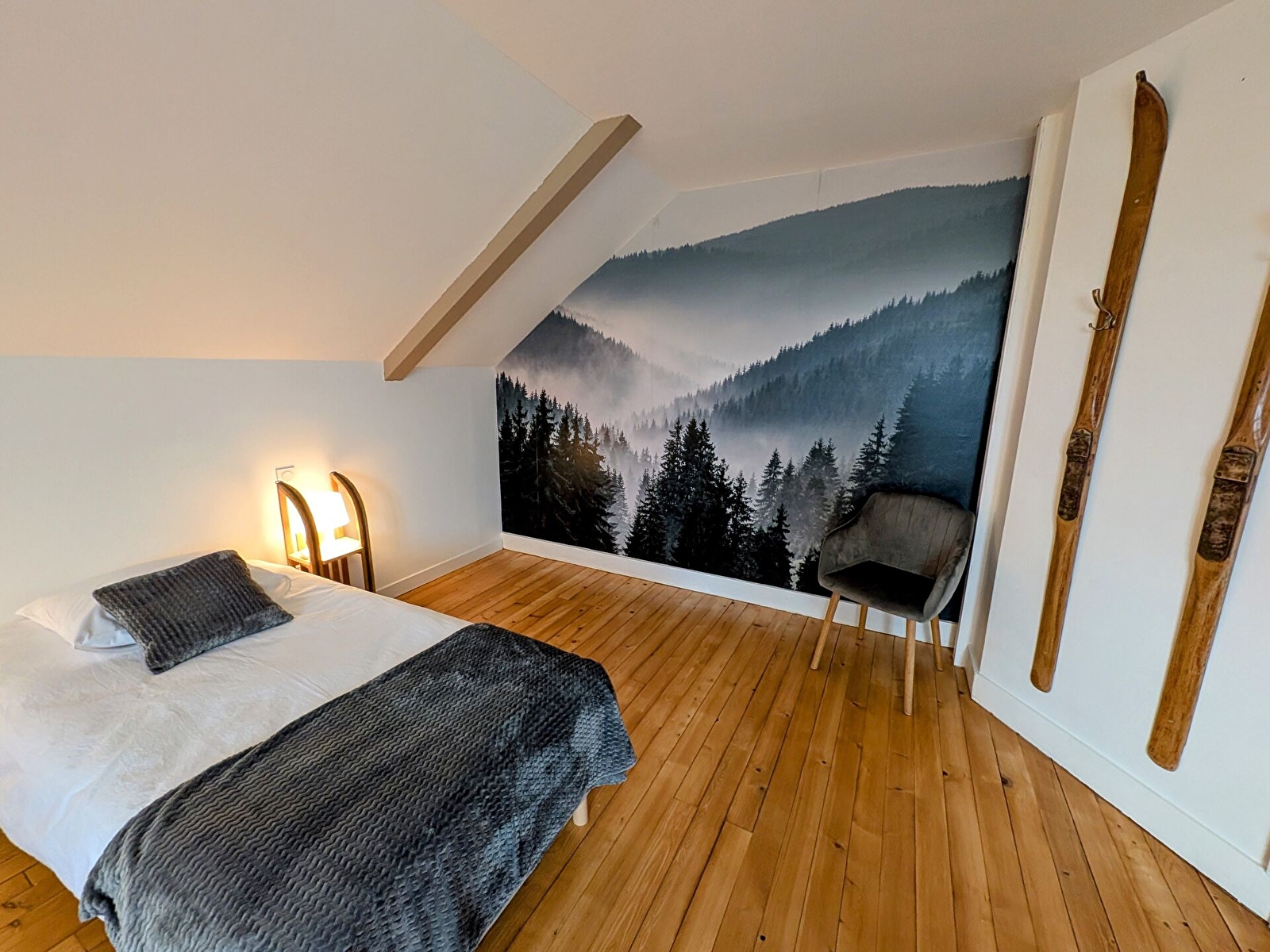 Actuellement aménagé pour 6 personnes, le gîte dispose de 3 chambres, chacune équipée de deux lits de 90 cm modulables en lit double selon les besoins. Chaque chambre bénéficie d’une décoration personnalisée et porte un nom évocateur : « Verger », « Montagne » et « Bretagne », offrant des ambiances distinctes et soignées.