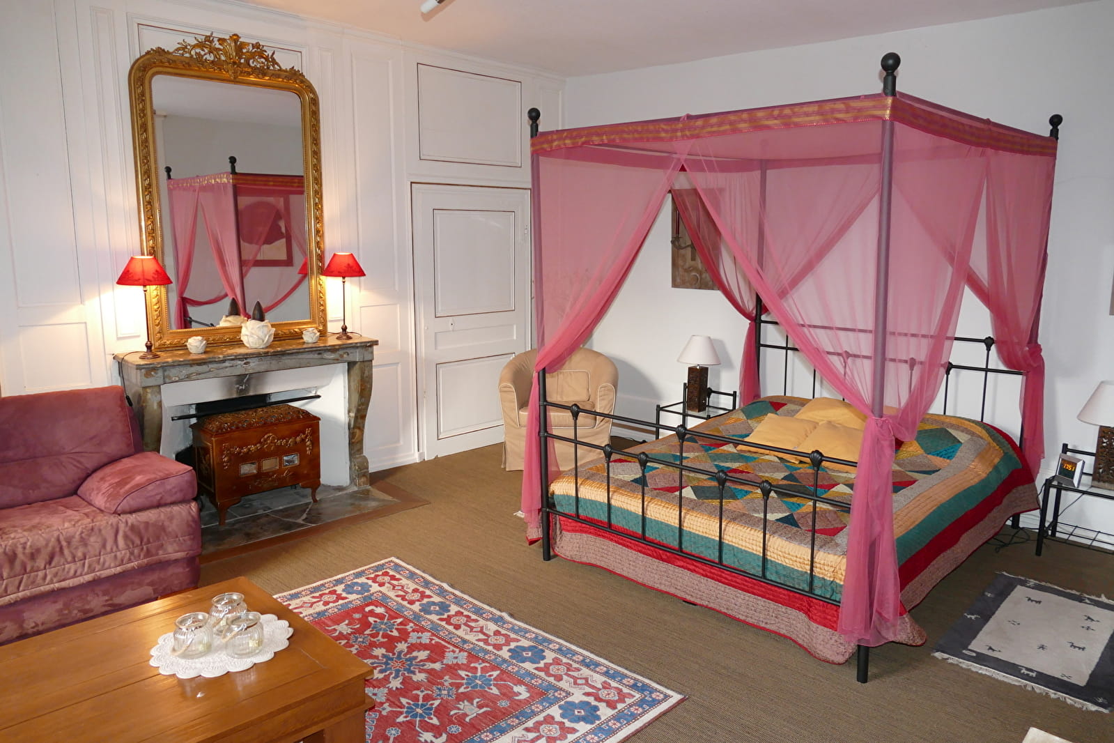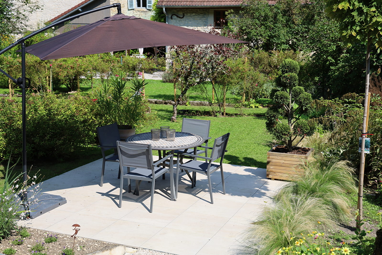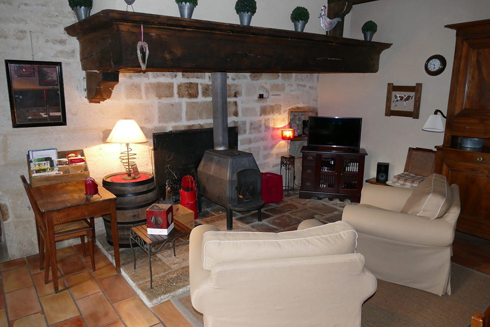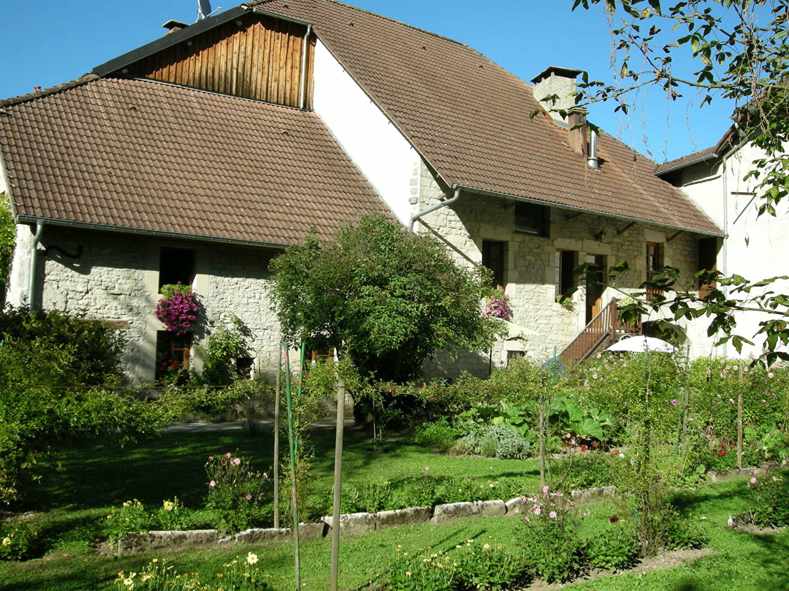 La pièce à vivre égayée par une imposante cheminée vous invite tantôt à la paresse, tantôt à de joyeuses agapes. Une partie du jardin arboré et fleuri vous est réservée, pour vous détendre, déjeuner…, à côté d’un petit bassin alimenté par une source.