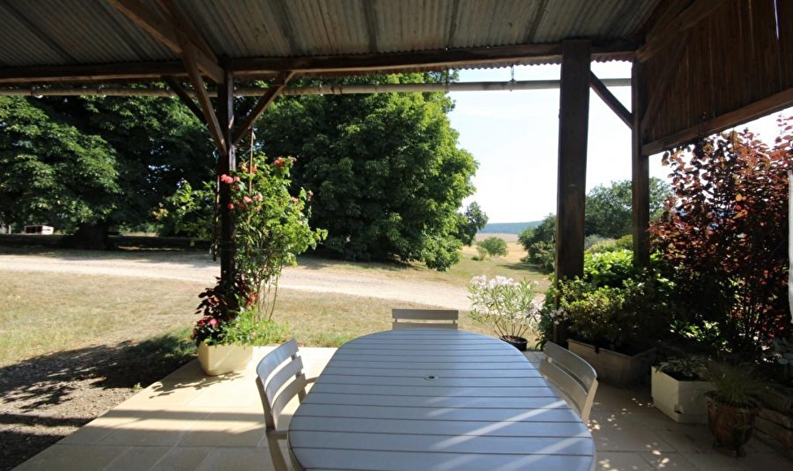 Séjour, cuisine, SDB, WC indépendant, abri voiture, terrasse, mobilier de jardin.